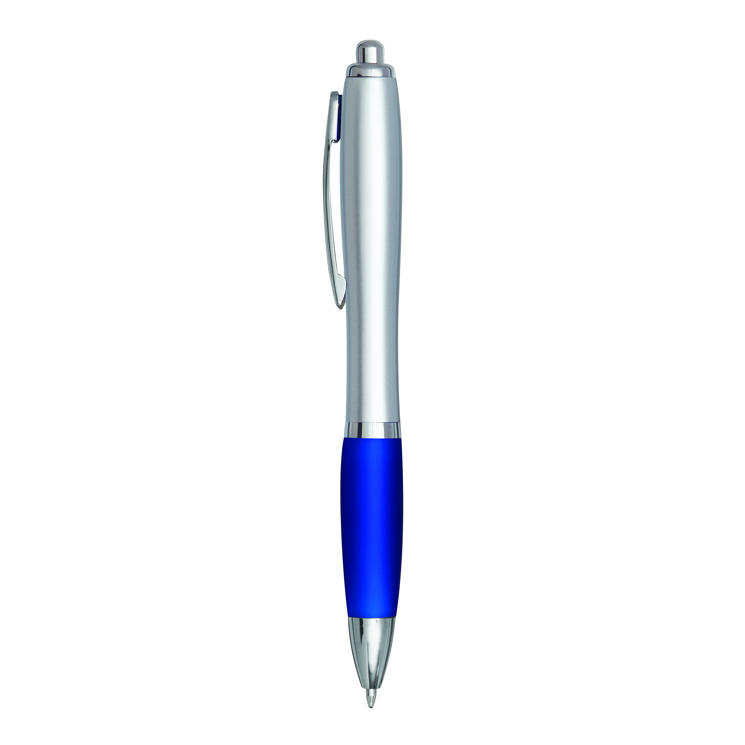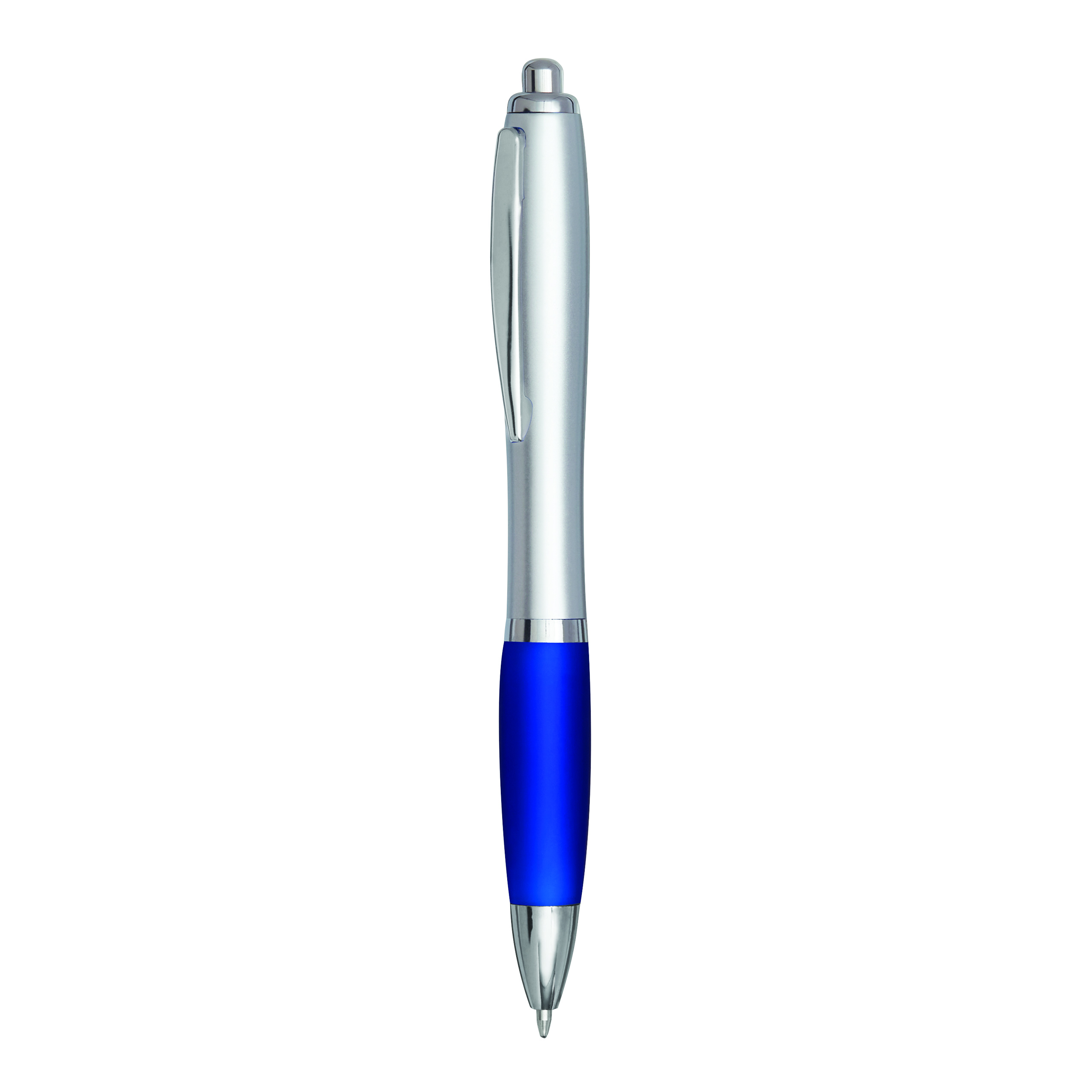 Kugelschreiber SWAYRABS: mit Schaft in taillierter Form aus recyceltem Kunststoff, gummierter Griffzone, Druckmechanismus, Großraummine, blauschreibend