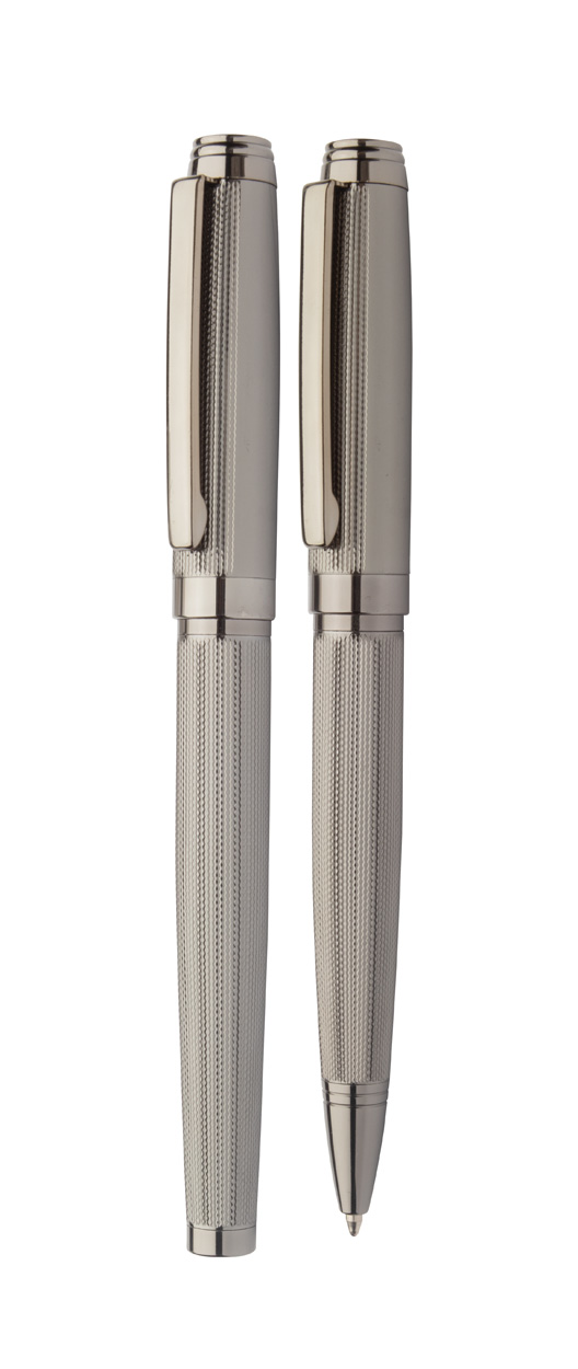 Elegantes Schreibset aus Metall mit gemustertem Schaft. Blauschreibend. Das Set besteht aus Kugelschreiber und Rollerball. Einzeln in schwarzer Geschenkbox. Marke: André Philippe.