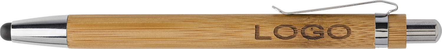 Kugelschreiber-Set aus Bambus, bestehend aus Kugelschreiber (blaue Mine) mit Touch-Pen und Druckbleistift mit Metall-Clip, verpackt in einer Pappbox in Bambus-Optik.