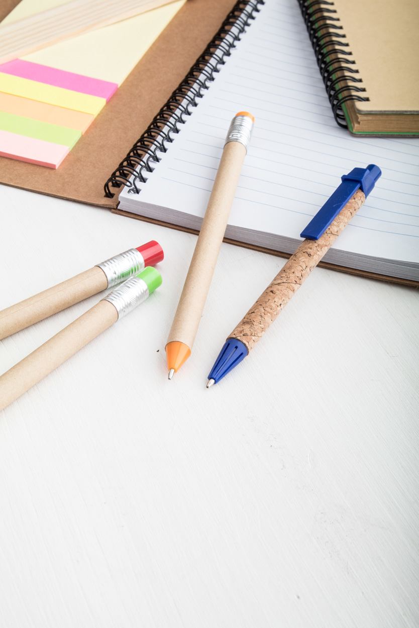 Kugelschreiber aud recyceltem Papier mit Korkummantelung und Kunststoffspitze und -clip, blauschreibend.