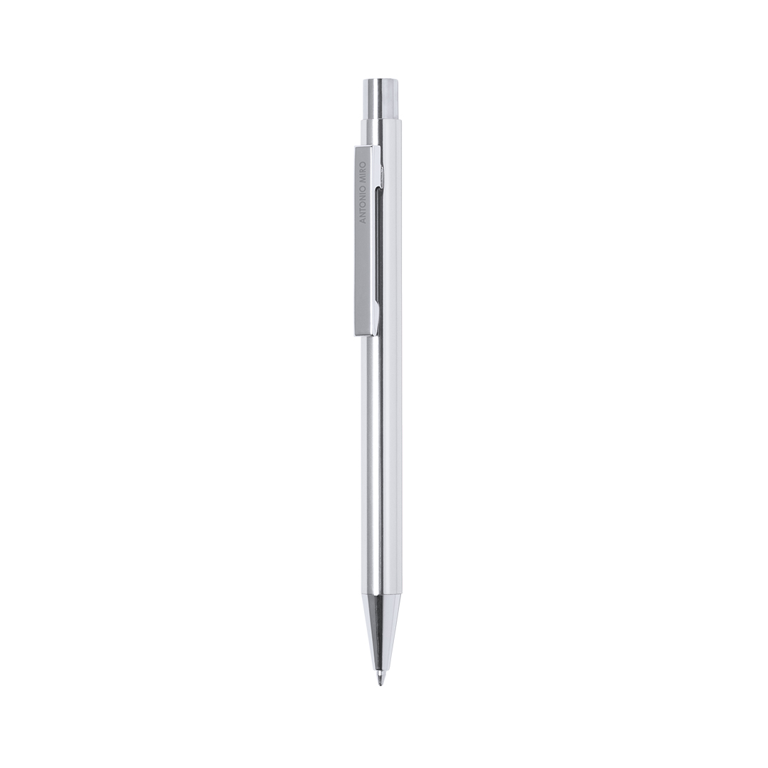 Druck-Kugelschreiber von Antonio Miró mit Aluminiumschaft in verschiedenen Farben und Silber. Präsentiert in einem Beutel mit dem Markenlogo. Blaue Tinte.