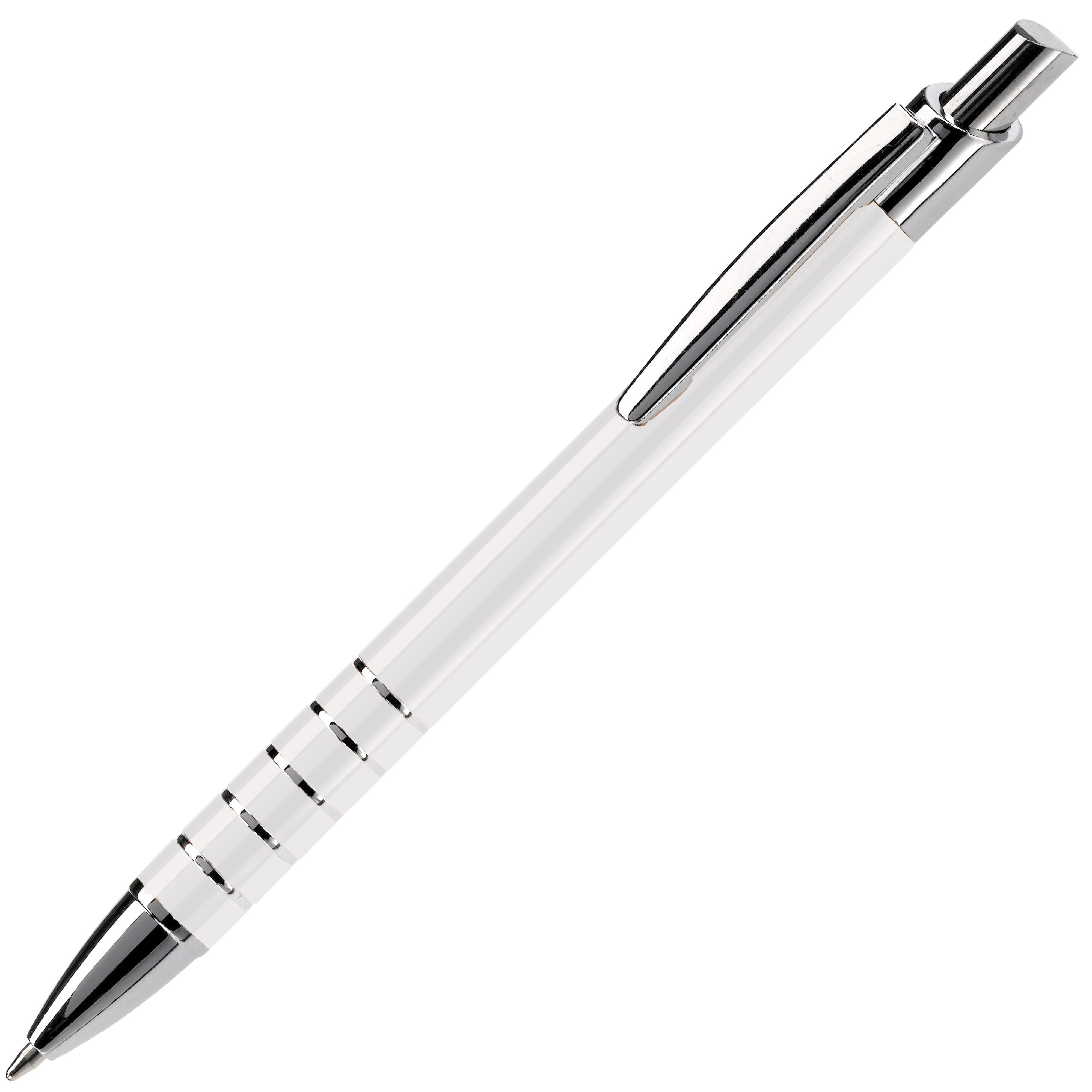 Schlanker Aluminium Kugelschreiber mit 5 chromfarbenden Ringen in der Griffzone und chromfarbenden Teilen. Schwarzschreibende Kunststoffmine.