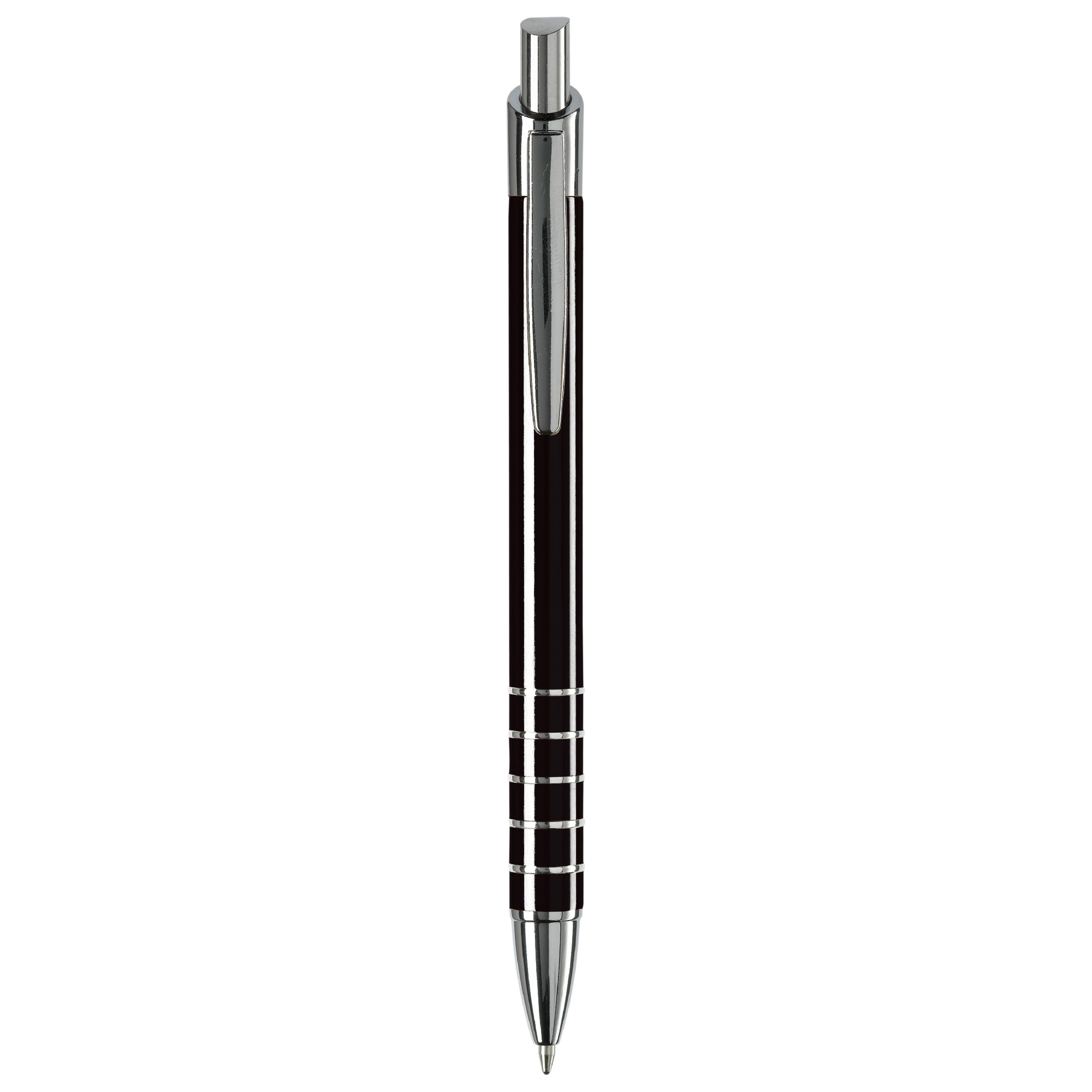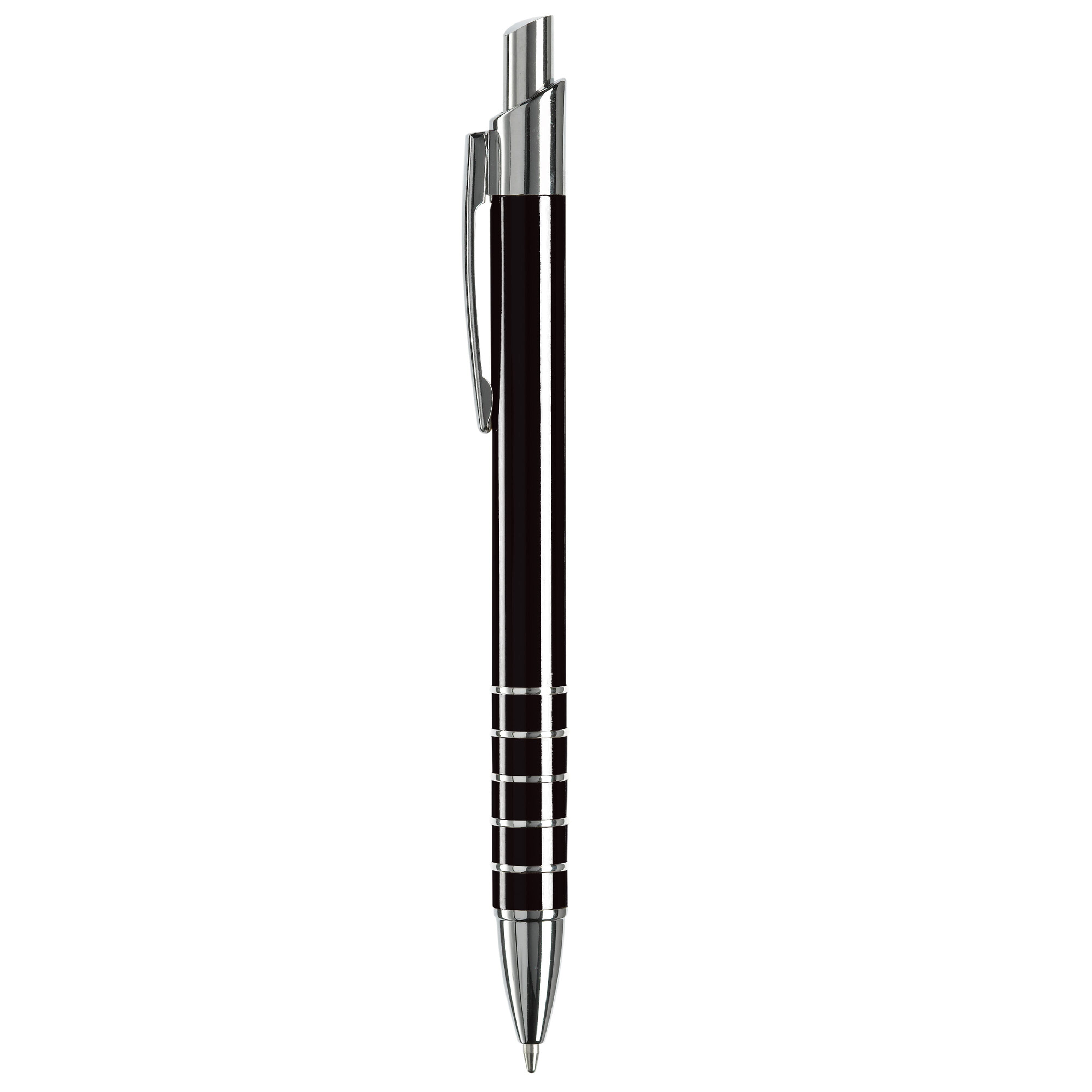 Schlanker Aluminium Kugelschreiber mit 5 chromfarbenden Ringen in der Griffzone und chromfarbenden Teilen. Schwarzschreibende Kunststoffmine.
