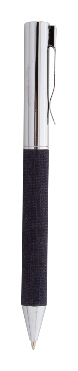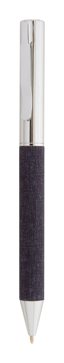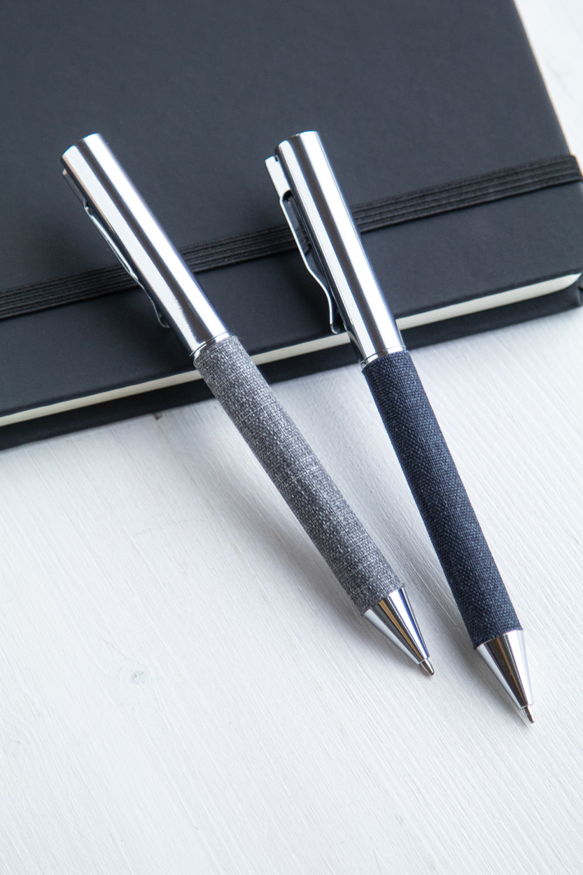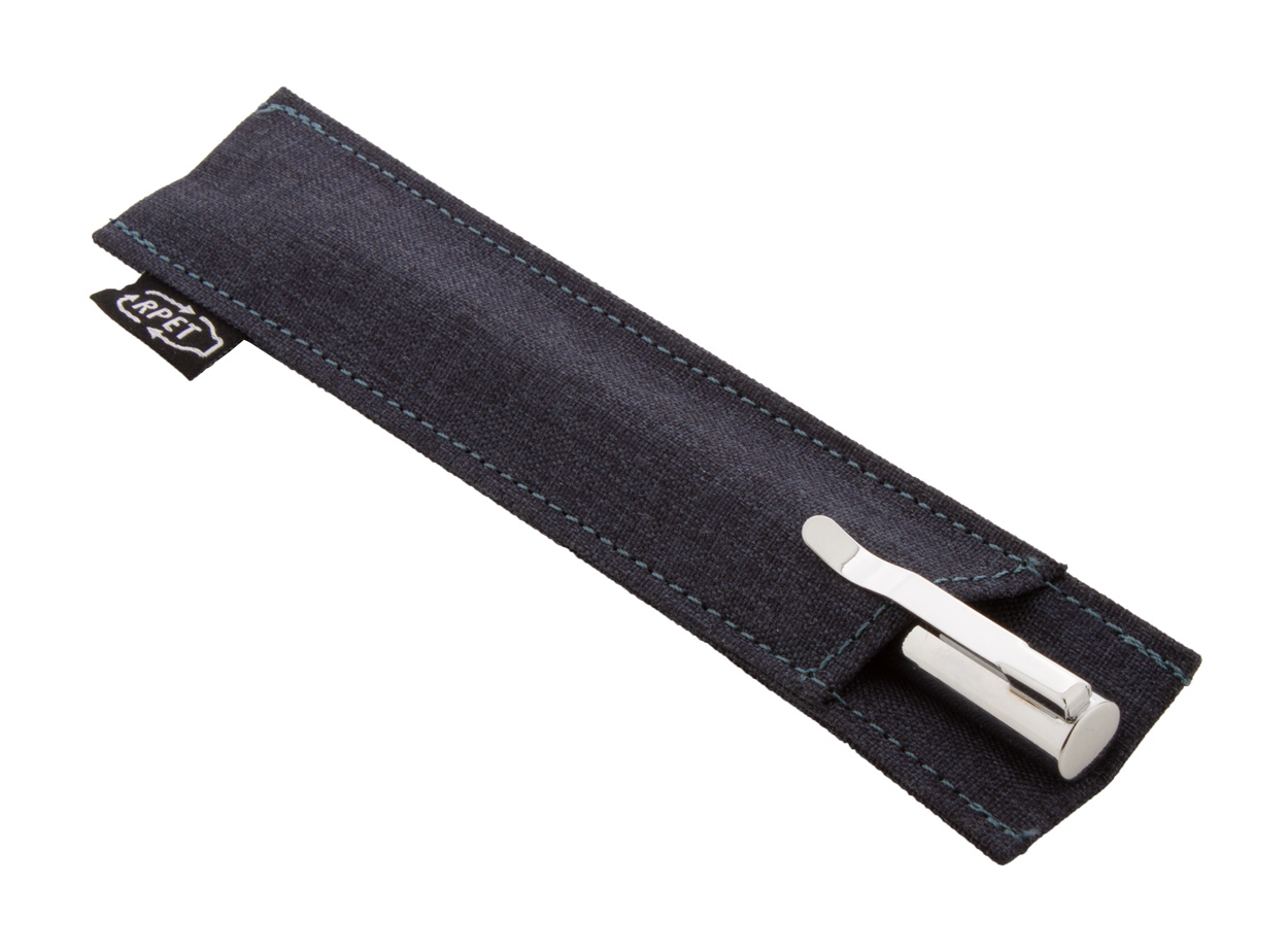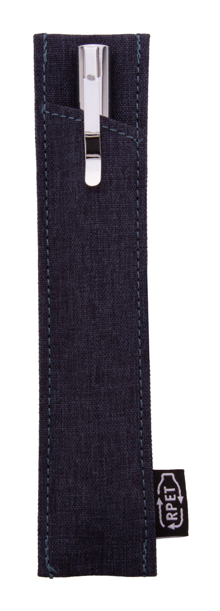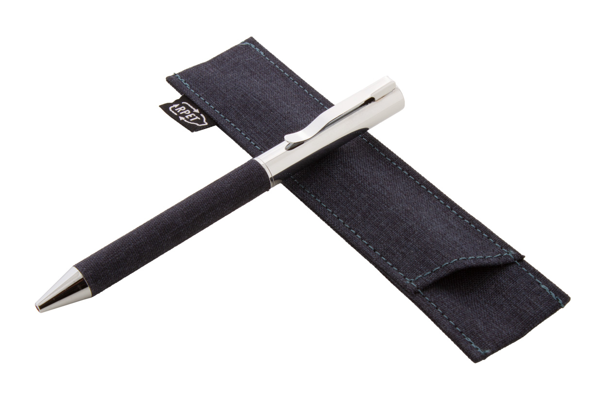 Drehkugelschreiber aus Metall mit einer Ummantelung aus RPET Polyester in einem farblich abgestimmten Etui aus RPET Polyester, blauschreibend.