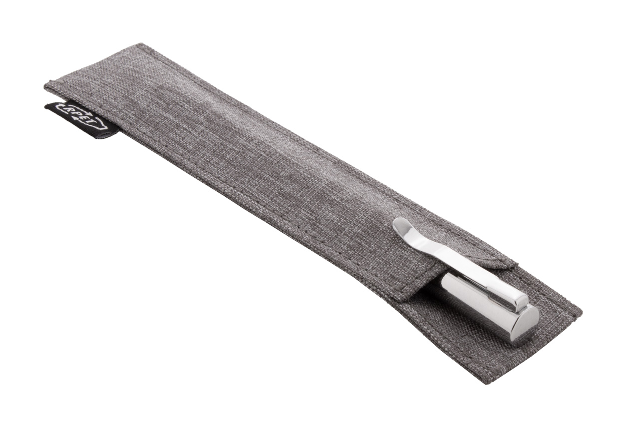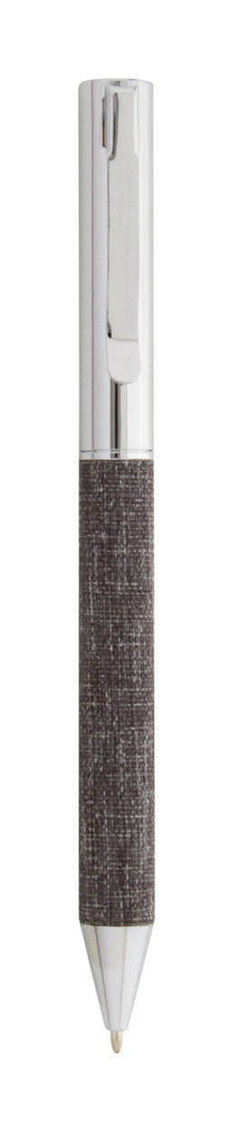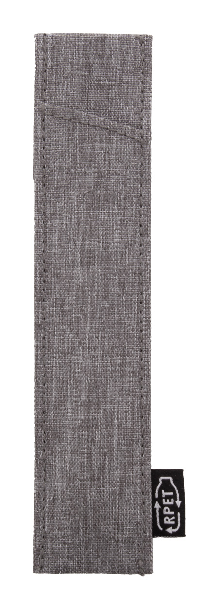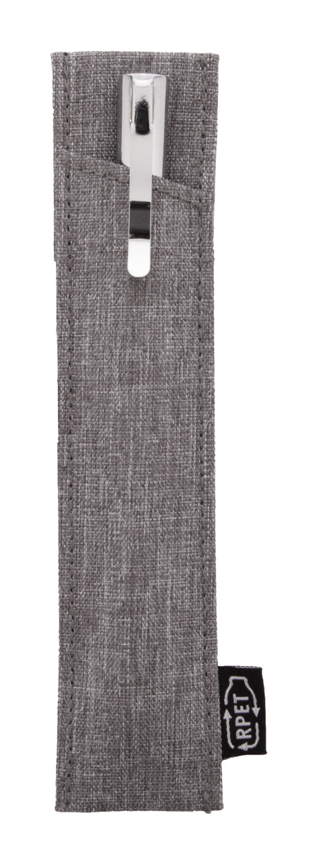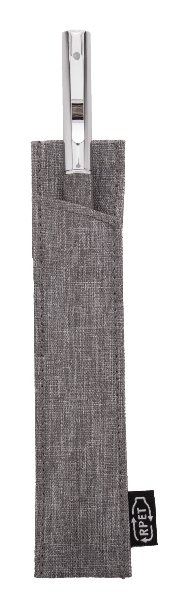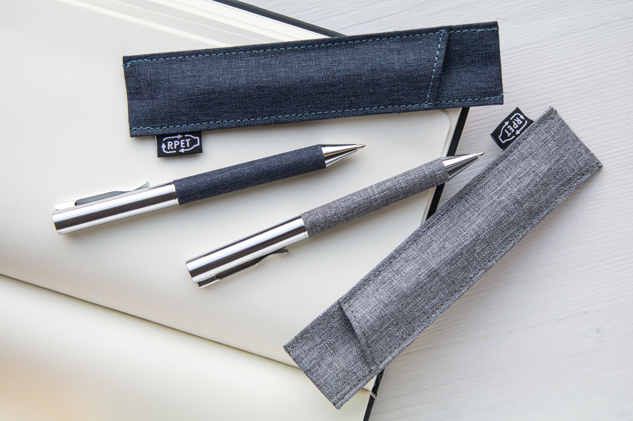 Drehkugelschreiber aus Metall mit einer Ummantelung aus RPET Polyester in einem farblich abgestimmten Etui aus RPET Polyester, blauschreibend.