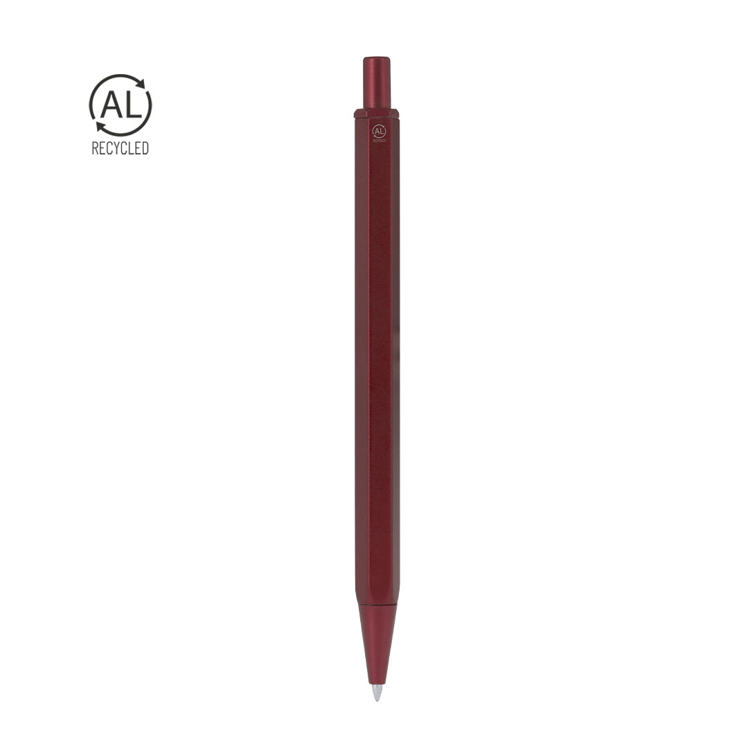 Eleganter Kugelschreiber aus recyceltem Aluminium. Mit markantem sechsseitigen Körper. Druckmechanismus aus recyceltem ABS und blauer Tinte. Mit markantem Logo für recyceltes Aluminium auf dem Stift. Recyceltes Aluminium ist ein Material mit nahezu unbegrenzten Recyclingmöglichkeiten, ohne seine ursprünglichen Eigenschaften zu verlieren und bei geringerem Energieverbrauch in diesem Prozess. GRS-Zertifizierung (Global Recycled Standard), die den Recyclingursprung des verwendeten Materials zur Herstellung des Produkts bestätigt. RABS ist ein hochgradig recycelbarer Kunststoff mit hoher Widerstandsfähigkeit und vielseitigen Anwendungen, der ihn zu einer umweltfreundlichen Lösung macht. Mit RCS-Zertifizierung, die den Recyclingursprung und mit RABS-Logo auf dem Stift bestätigt.