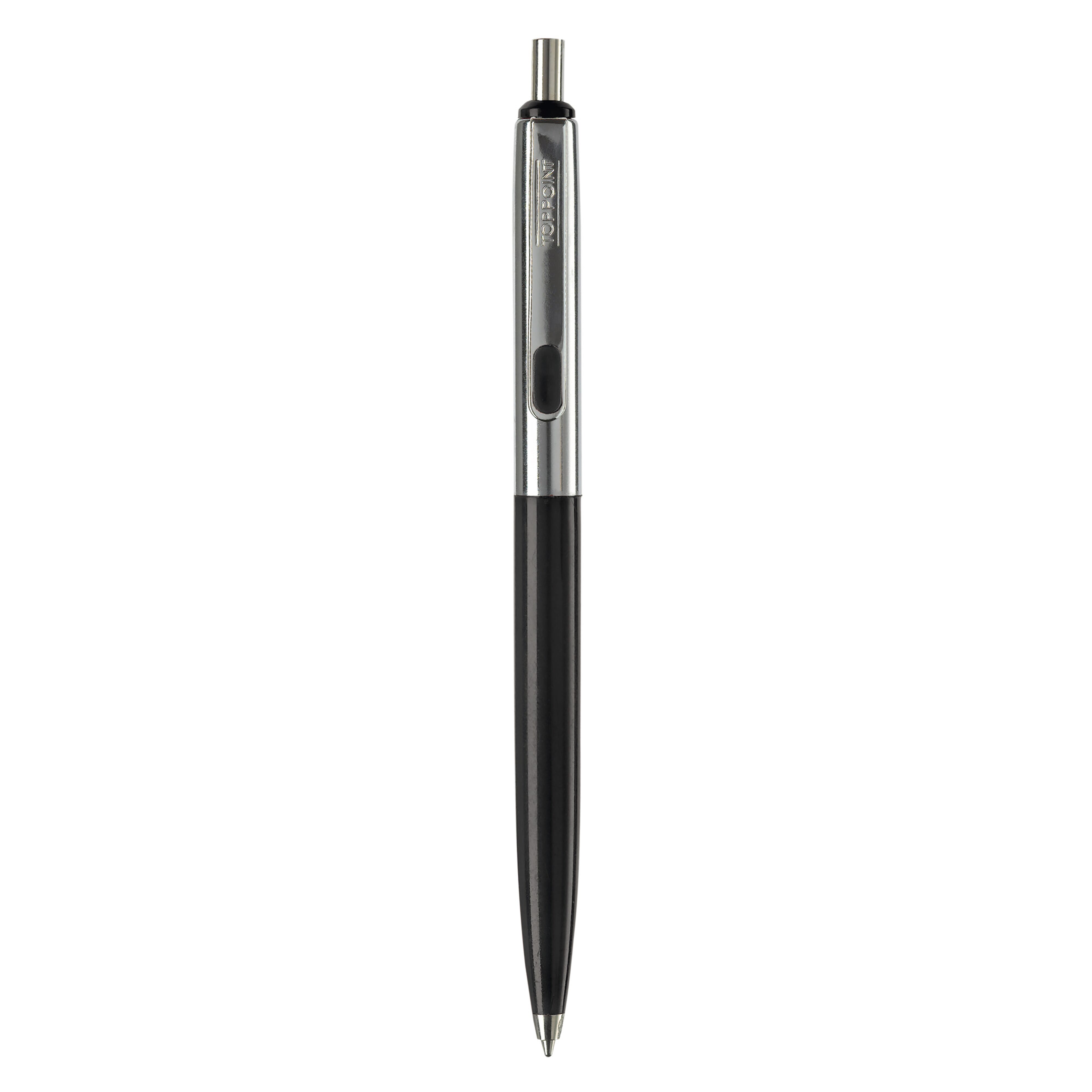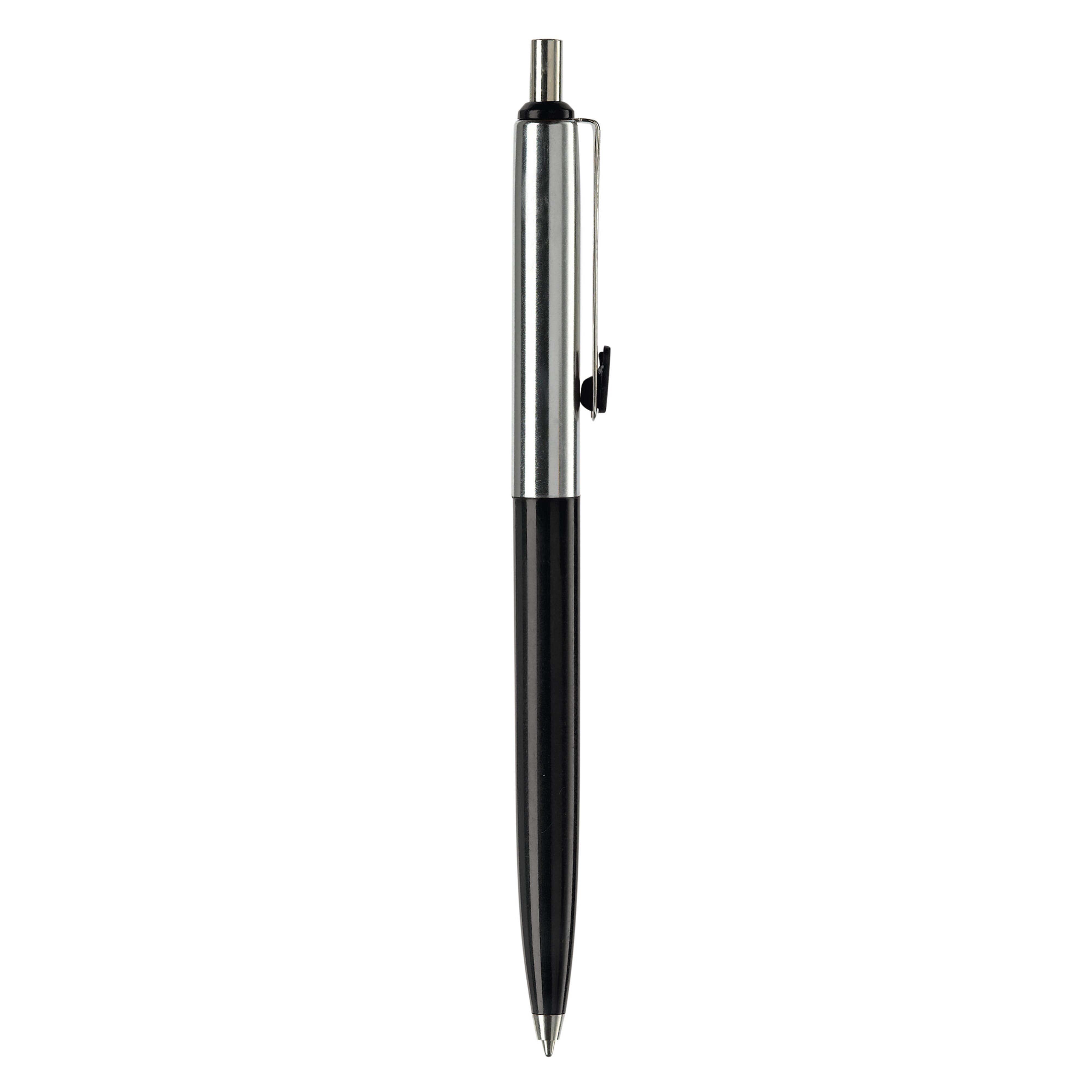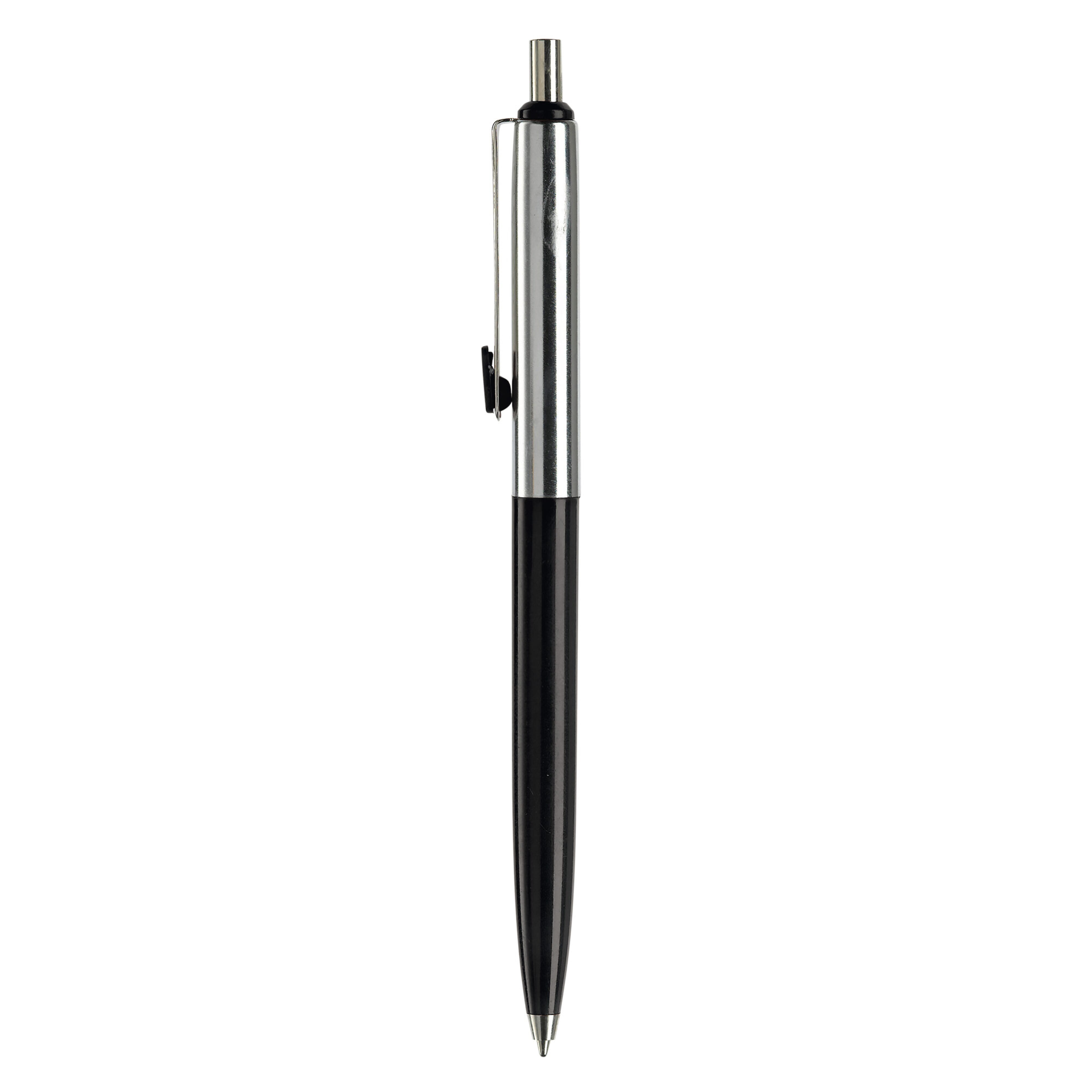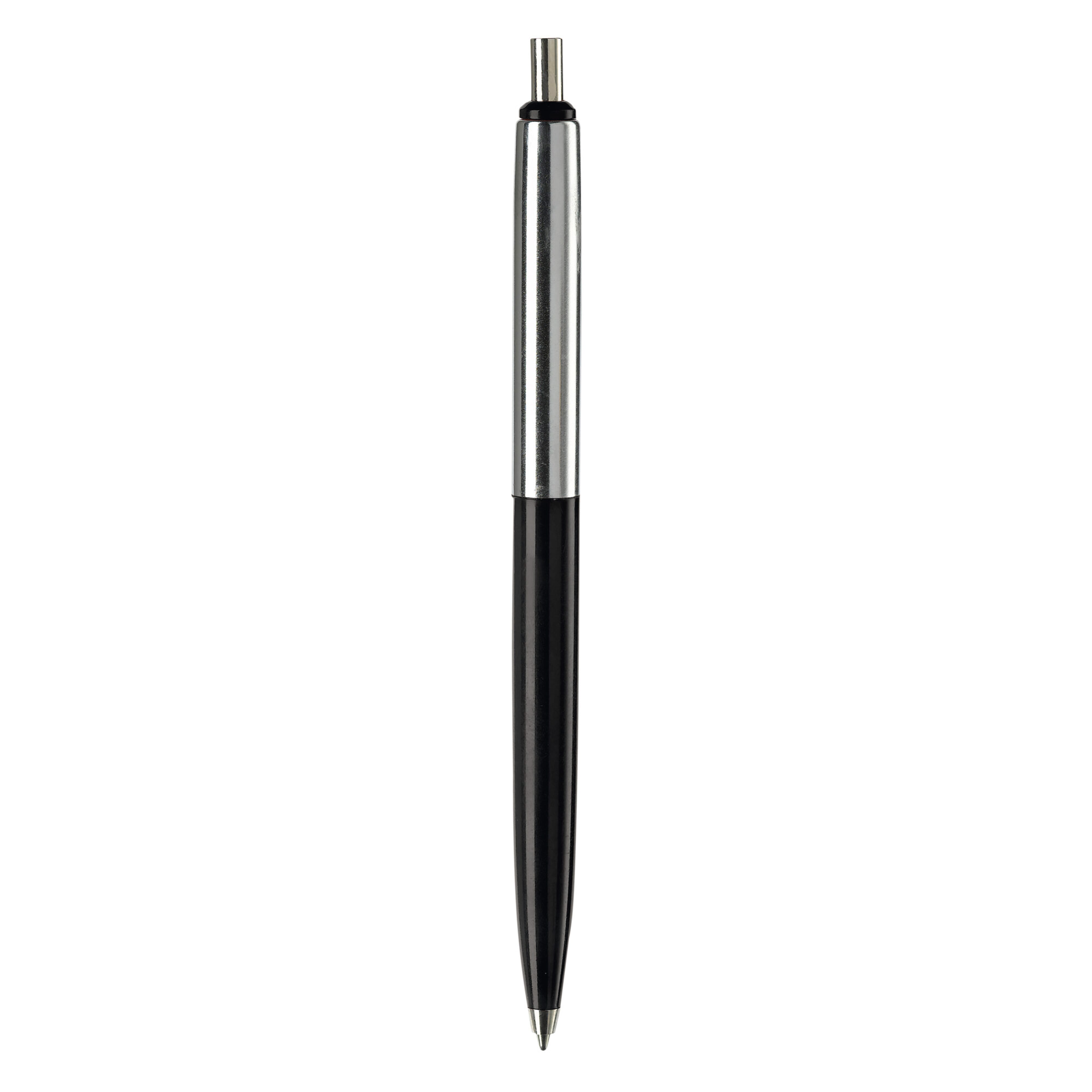 Klassischer Metallkugelschreiber. Farbige und verchromte Elemente. Blauschreibende Metallmine mit langer Schreibleistung.