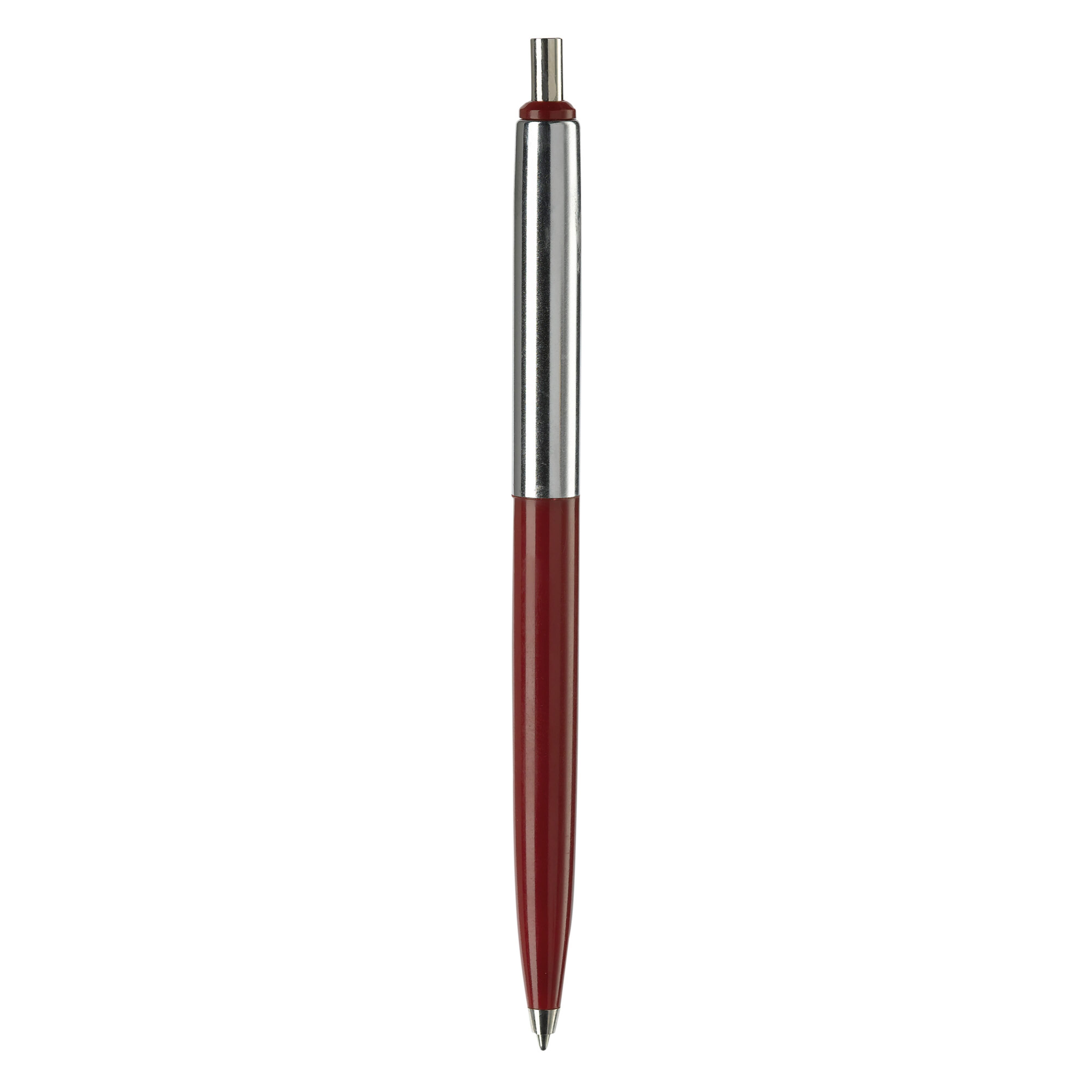 Klassischer Metallkugelschreiber. Farbige und verchromte Elemente. Blauschreibende Metallmine mit langer Schreibleistung.