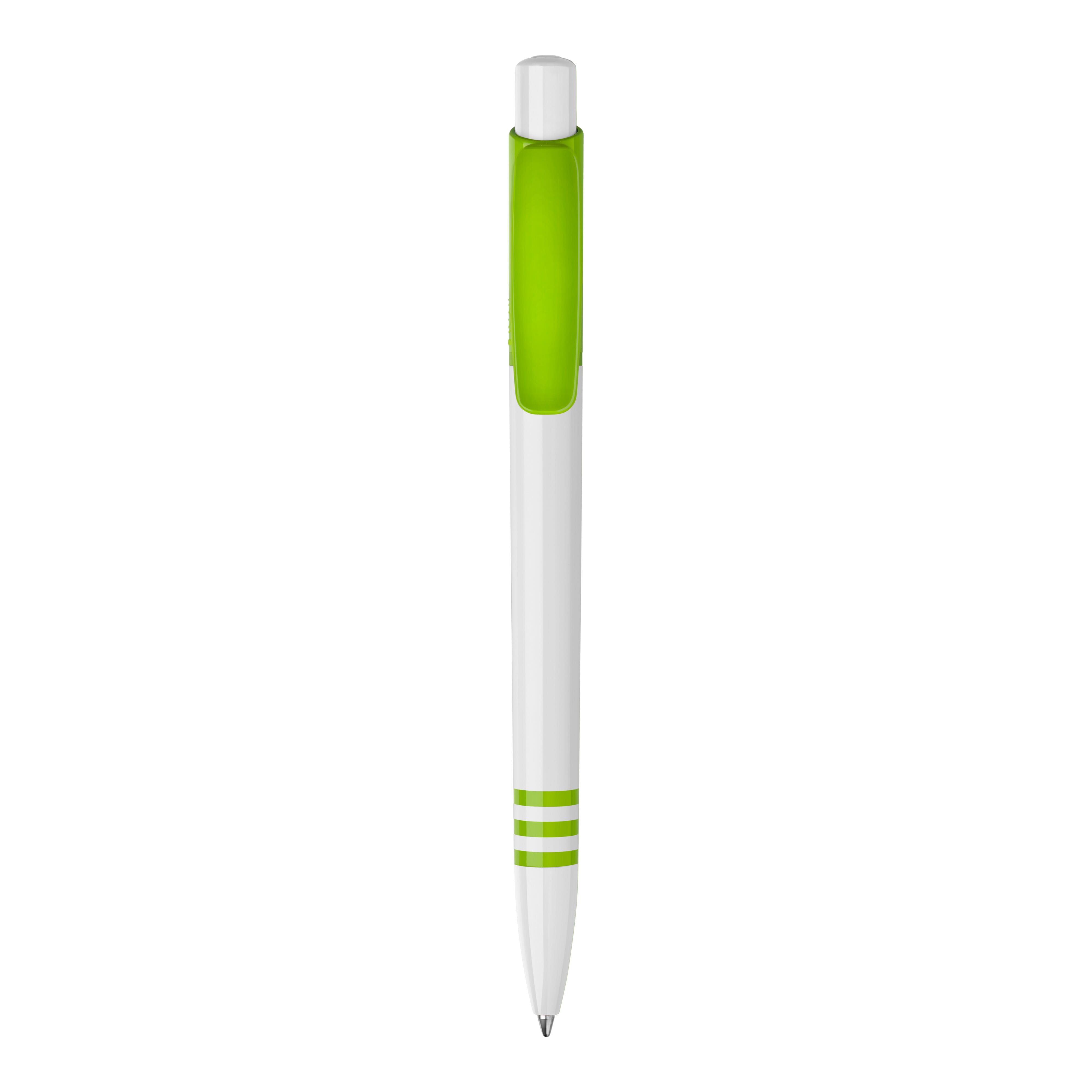 Der Hardcolour Kugelschreiber Tropic hat eine große Druckfläche auf dem Clip und dem Schaft. Eine ansprechende Kombination aus weißem Schaft und weißem Drücker sowie einem farbigen Clip. Der Schaft hat drei farbige Ringe in der gleichen Farbe wie der Clip. Druckkugelschreiber ausgestattet mit einer blau schreibenden Jumbo-Refill-Mine. Der Stift besteht aus ABS-Kunststoff und wird in Europa hergestellt. Ab einer Abnahmemenge von 5.000 Stück sind eigene Farbkombinationen möglich.