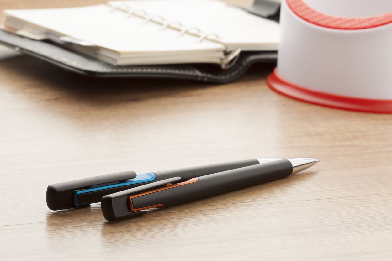 Kunststoff-Kugelschreiber mit verchromter Spitze und farbigen Elementen, blauschreibend.