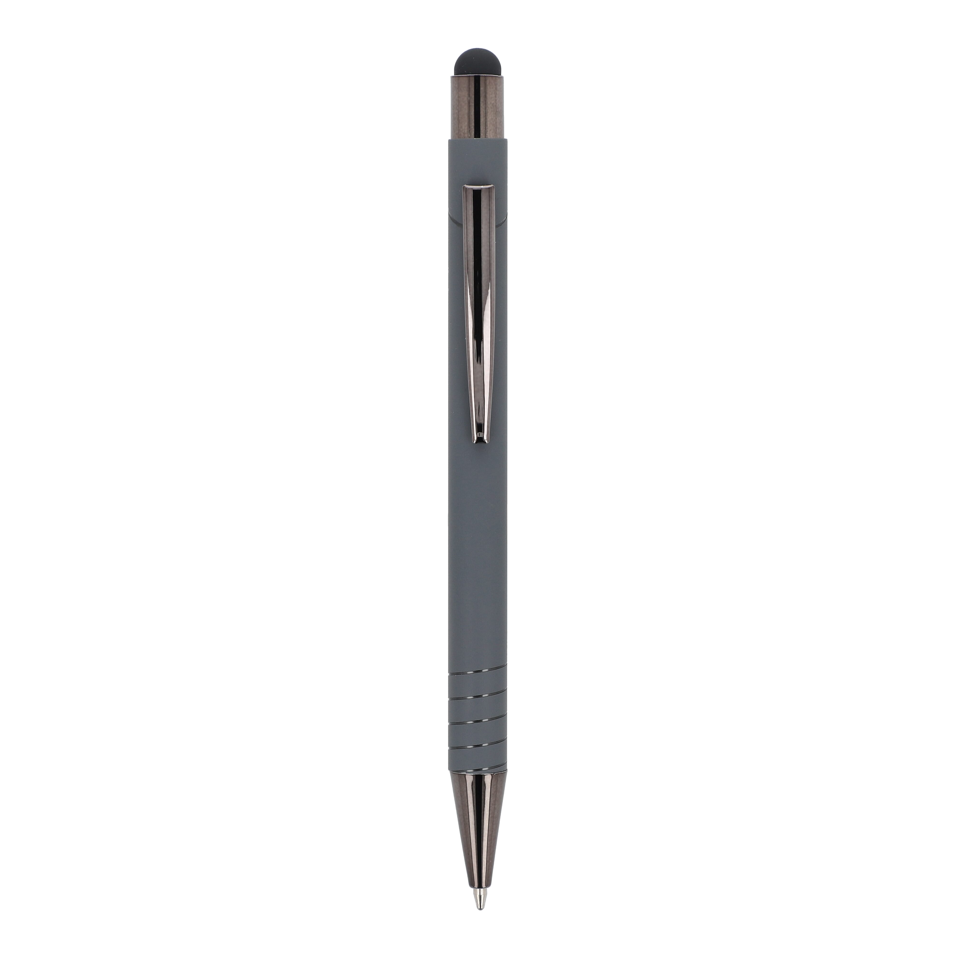 Kugelschreiber mit Metallclip, Stylus-Funktion und Softtouch-Oberfläche. Der Druckknopf, der Clip und die Ringe sind in passenden glänzenden Farben gehalten. Der Kugelschreiber wird mit einer blauen Jumbo-Mine geliefert.