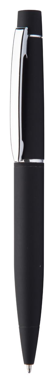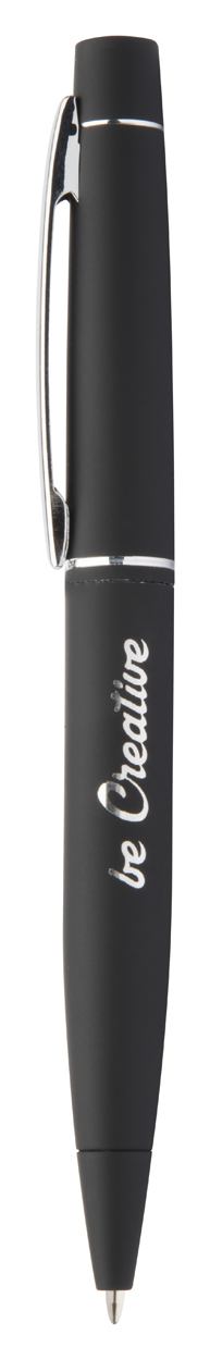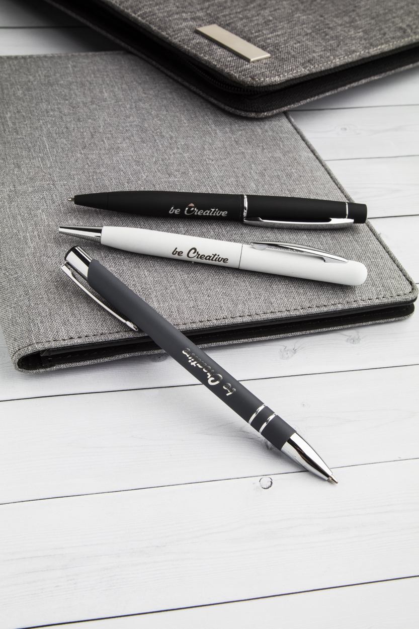 Drehkugelschreiber aus Metall mit gummierter Oberfläche und Spezialbeschichtung für eine Spiegelgravur, blauschreibend.
