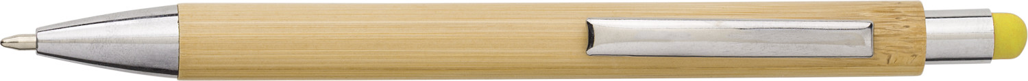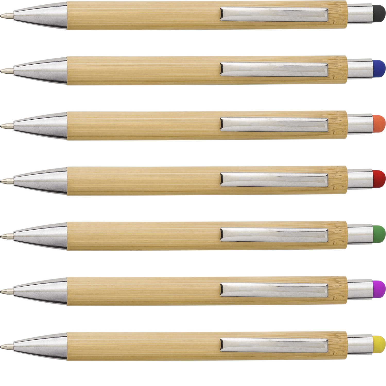 Kugelschreiber aus Bambus mit Kunststoffspitze und -oberseite, inkl. Touch-Pen. Der Clip ist aus Metall. Blaue Mine.
