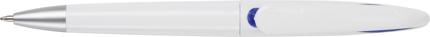 Drehkugelschreiber aus Kunststoff, weiß mit farbigen Akzenten und schwarzer Mine.
