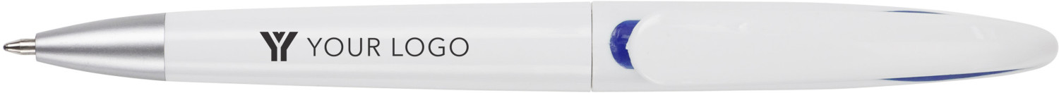 Drehkugelschreiber aus Kunststoff, weiß mit farbigen Akzenten und schwarzer Mine.