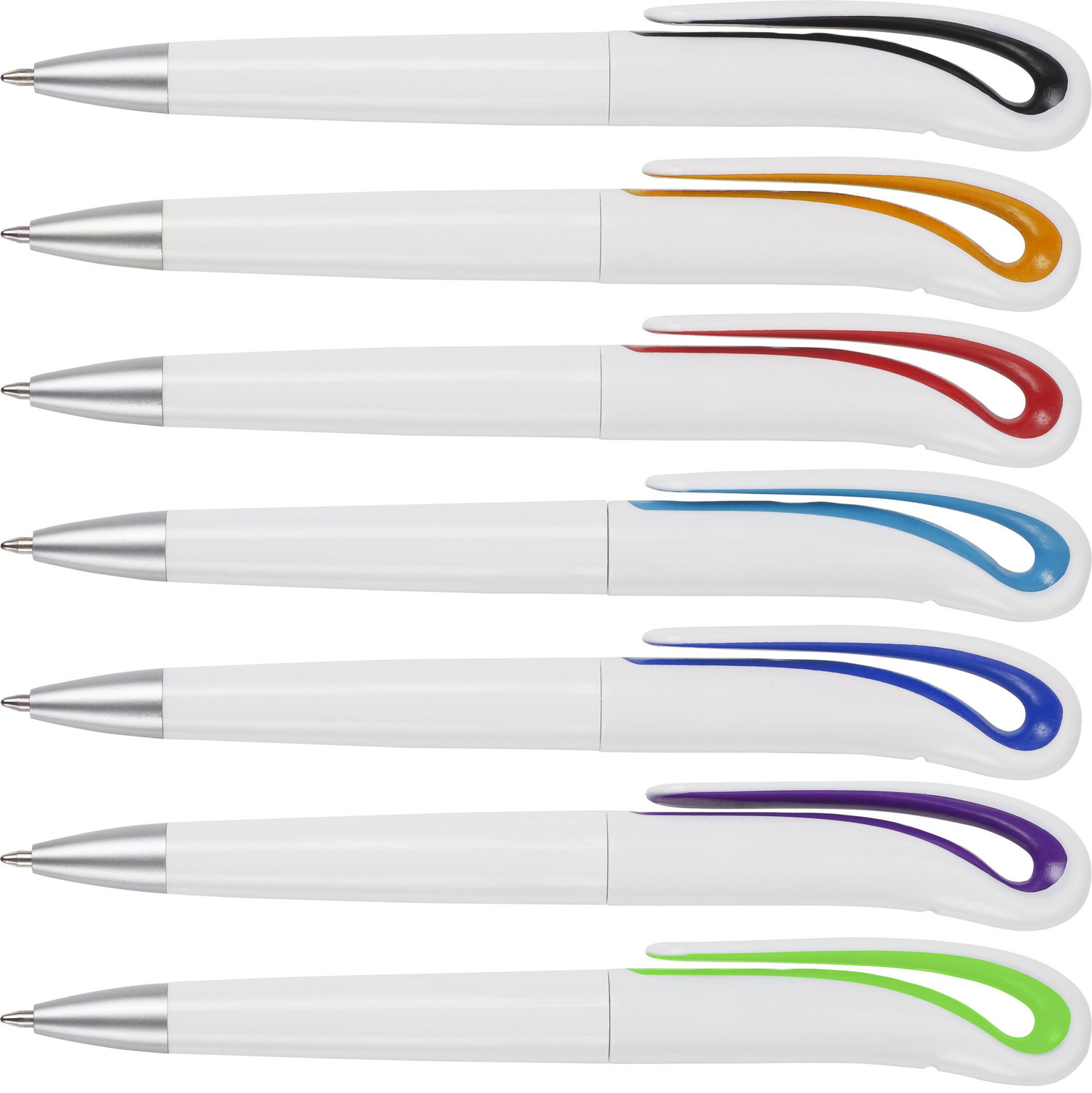 Drehkugelschreiber aus Kunststoff, weiß mit farbigen Akzenten und schwarzer Mine.