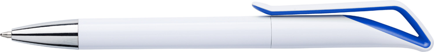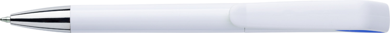 Beschreibung: Drehkugelschreiber aus Kunststoff, mit farbigen Akzenten und blauer Mine.