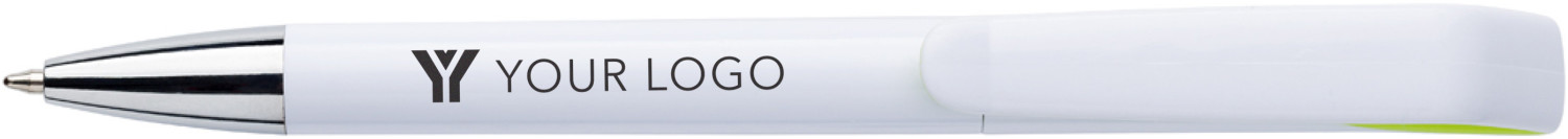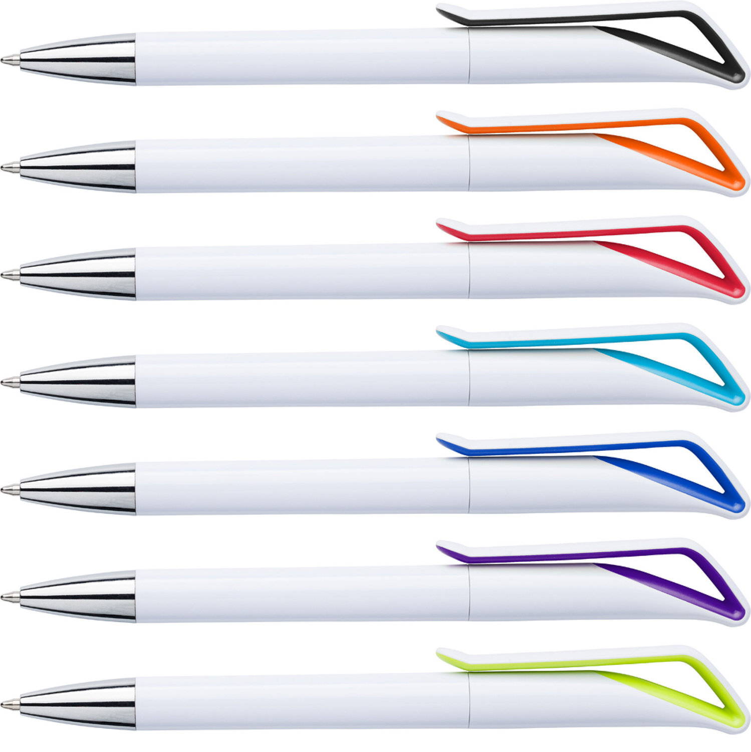 Beschreibung: Drehkugelschreiber aus Kunststoff, mit farbigen Akzenten und blauer Mine.
