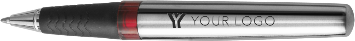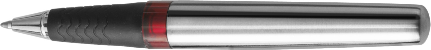 Kugelschreiber aus Metall, mattgebürstet, mit Kunststoff-Zierring, gummierter Griffzone und schwarzer Mine.