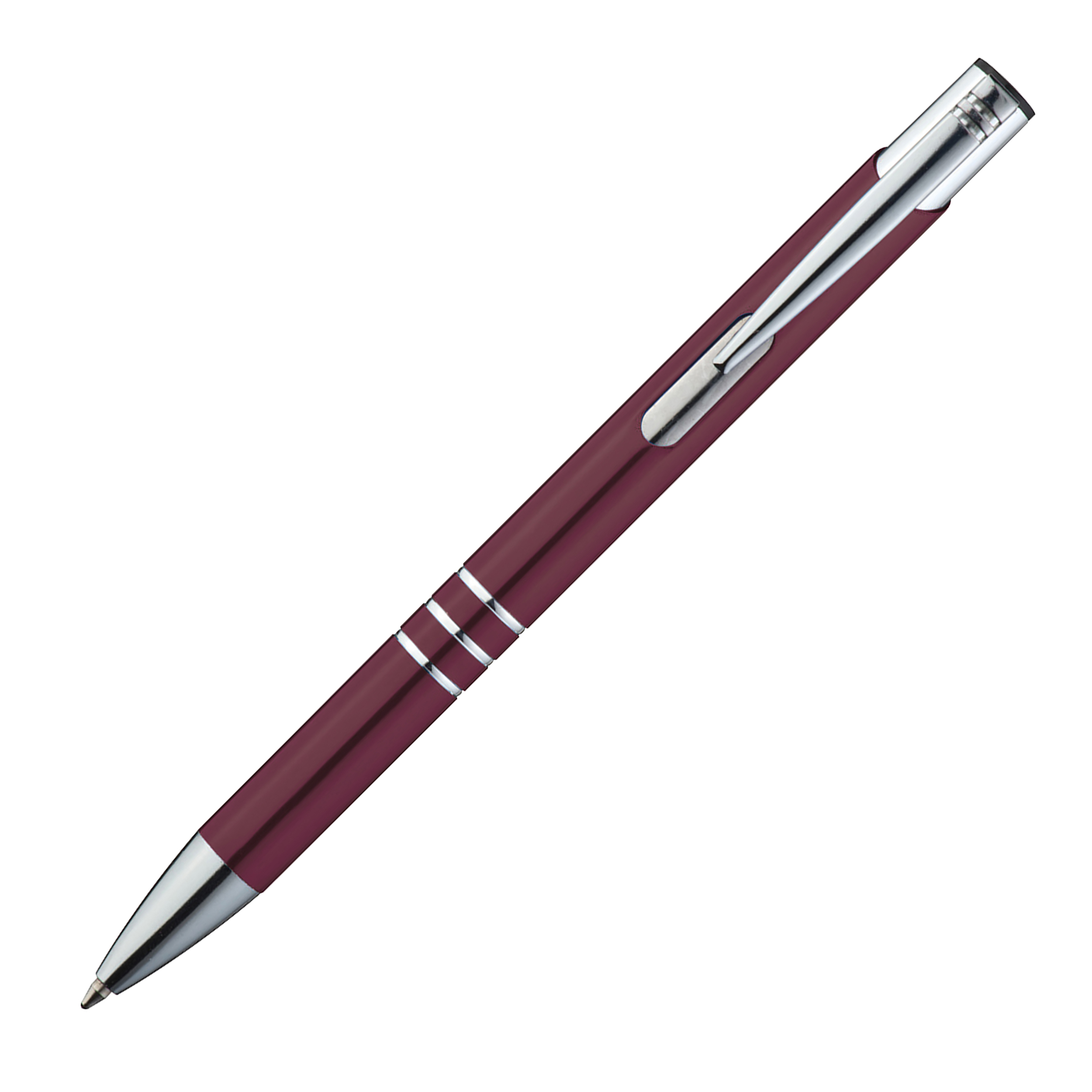 Eloxierter Kugelschreiber aus Metall mit 3 Zierringen und blau schreibender Großraummine. Ihre Werbung wird rechts vom Clip gelasert.