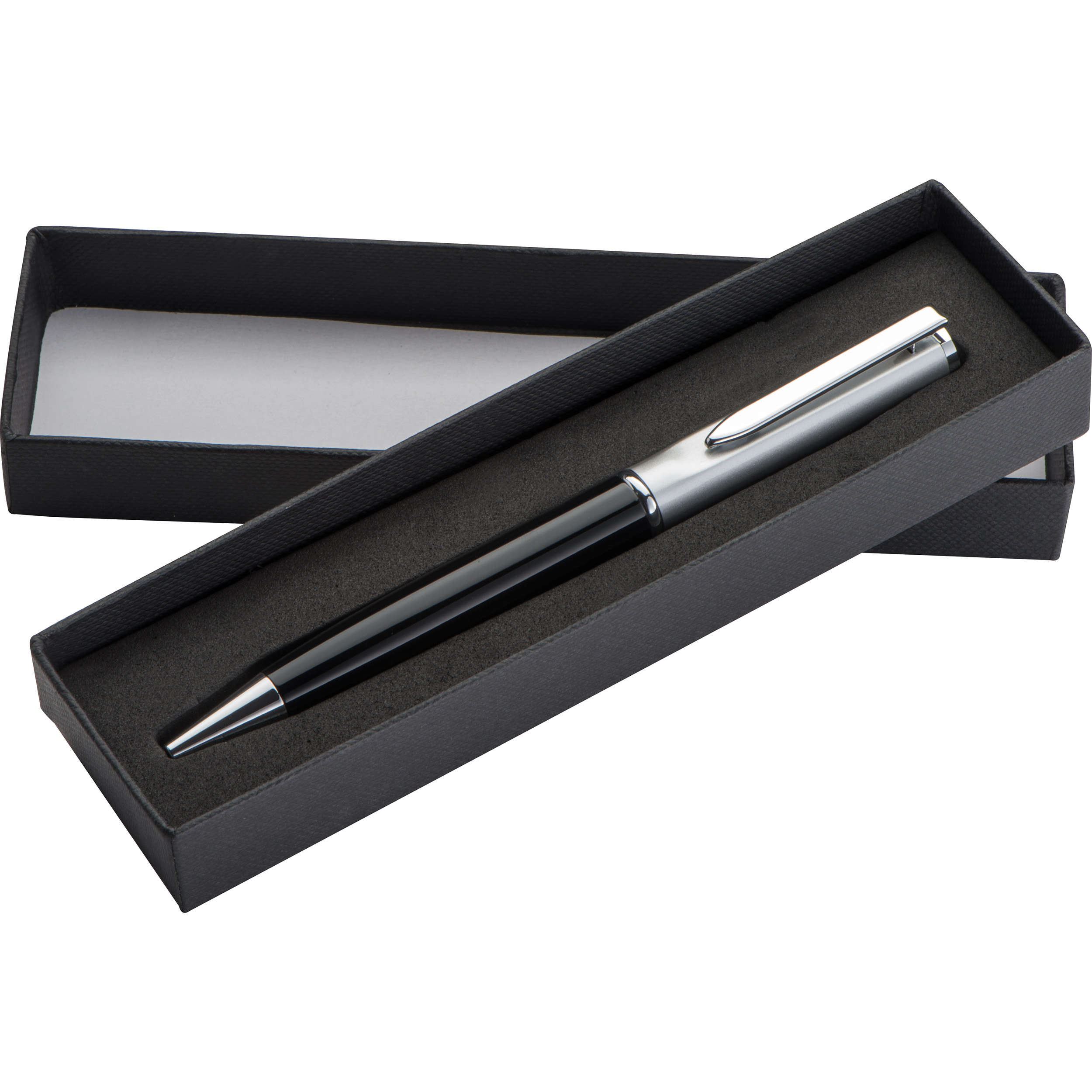 Eleganter Drehkugelschreiber aus Metall mit silbernem Oberteil und blau schreibender Großraummine. Geliefert wird der Kugelschreiber in einer Karton-Box*. Ihre Werbung wird rechts vom Clip gelasert.