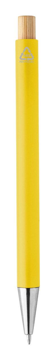 Kugelschreiber aus recyceltem ABS-Kunststoff mit Bambusdrücker und Metallclip, blauschreibend.