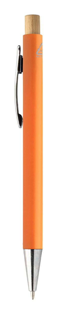 Kugelschreiber aus recyceltem ABS-Kunststoff mit Bambusdrücker und Metallclip, blauschreibend.