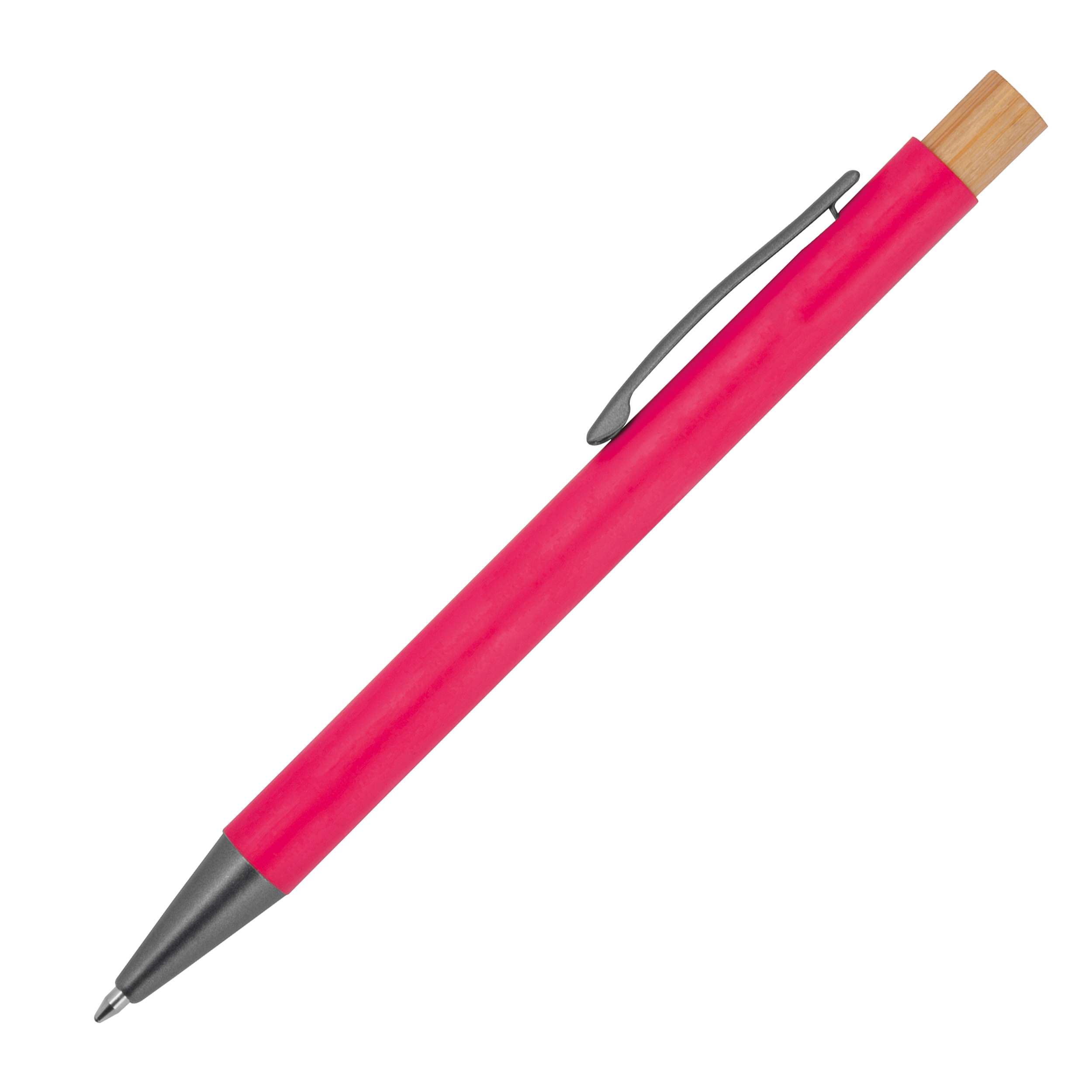 Kugelschreiber aus recyceltem Aluminium mit Bambusdrücker, Metallclip und blau schreibender Großraummine. Ihre Werbung wird rechts vom Clip graviert.