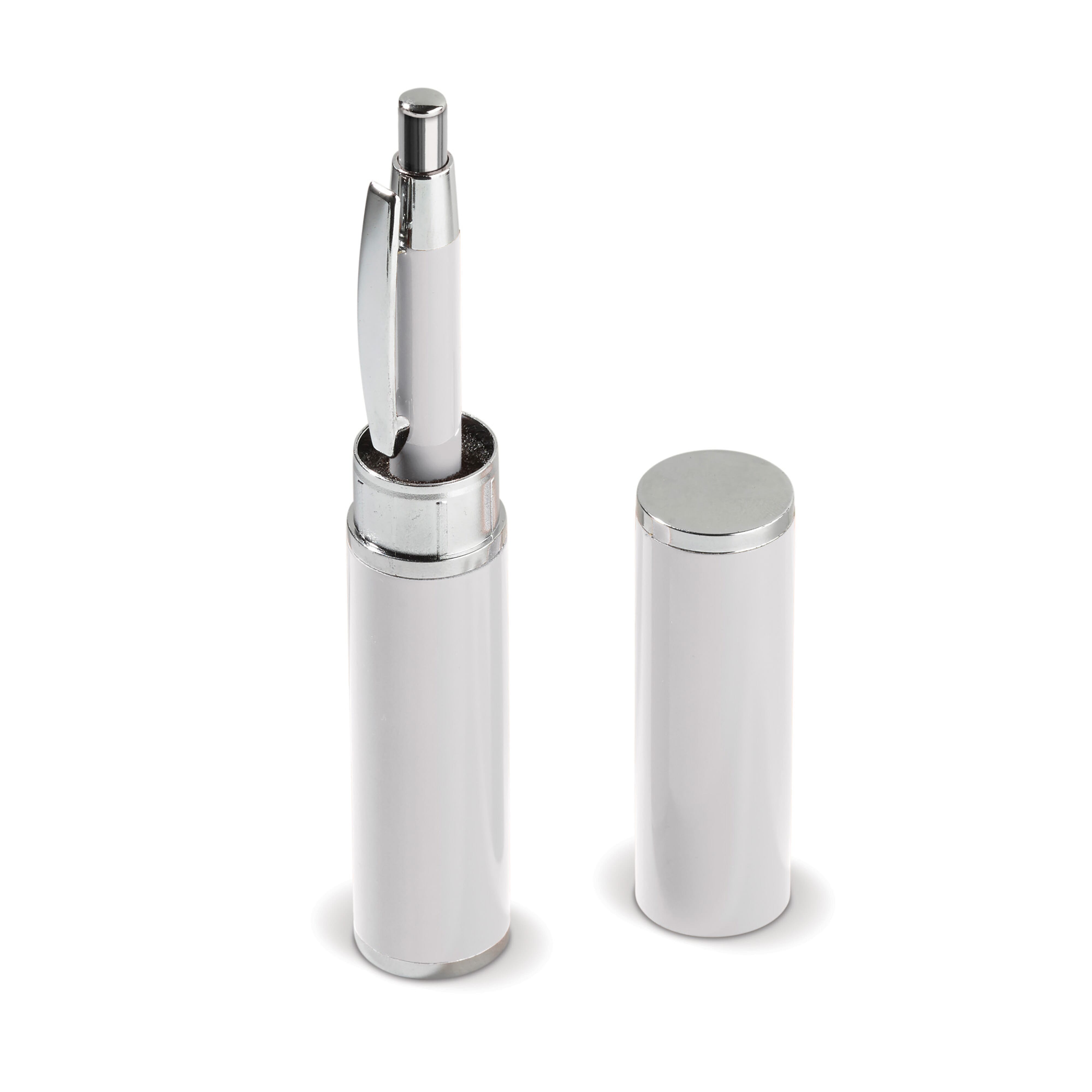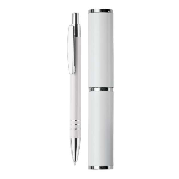 Aluminium Kugelschreiber mit 3 verchromten Ringen. Der Kugelschreiber ist in einem Aluminium Köcher verpackt.