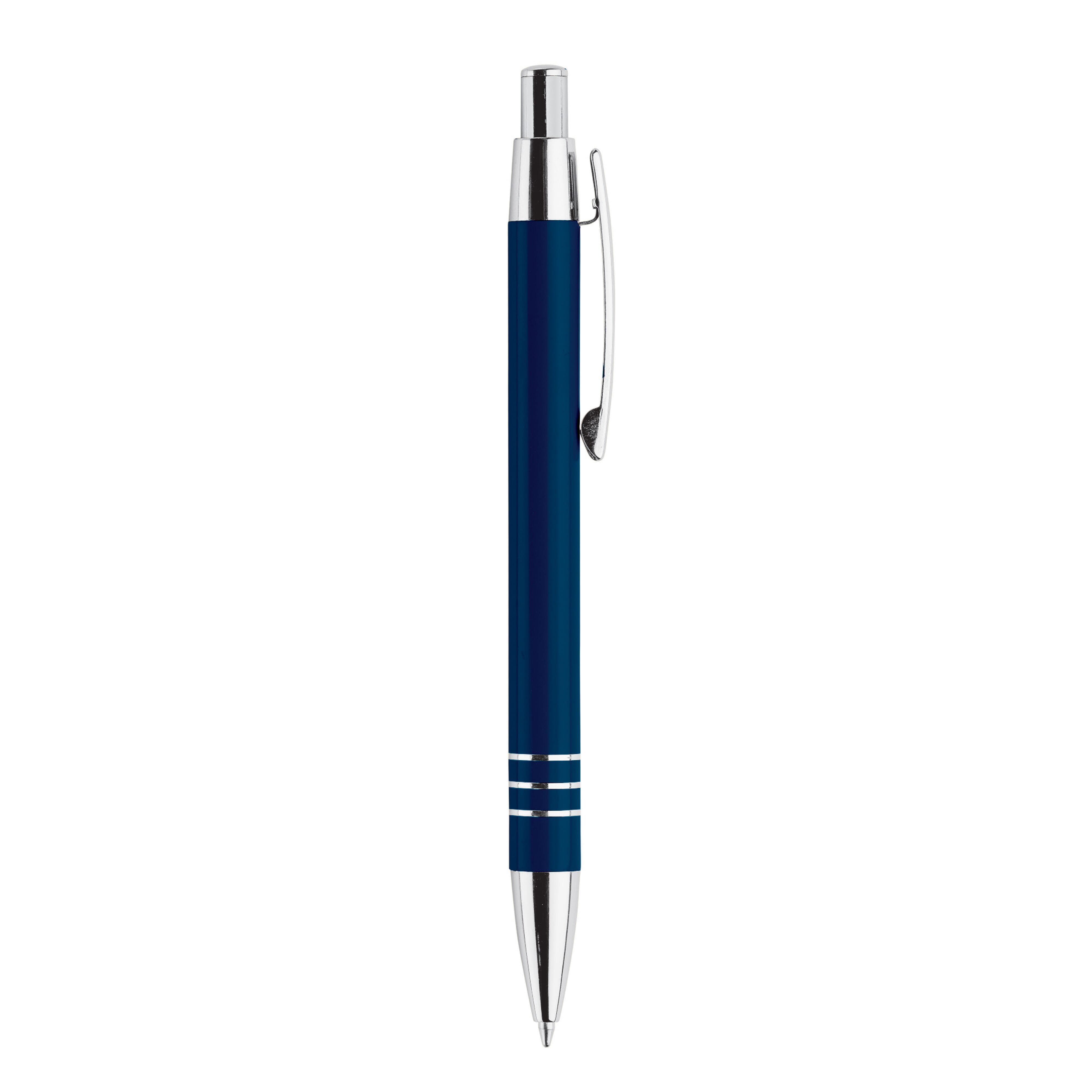 Aluminium Kugelschreiber mit 3 verchromten Ringen. Der Kugelschreiber ist in einem Aluminium Köcher verpackt.