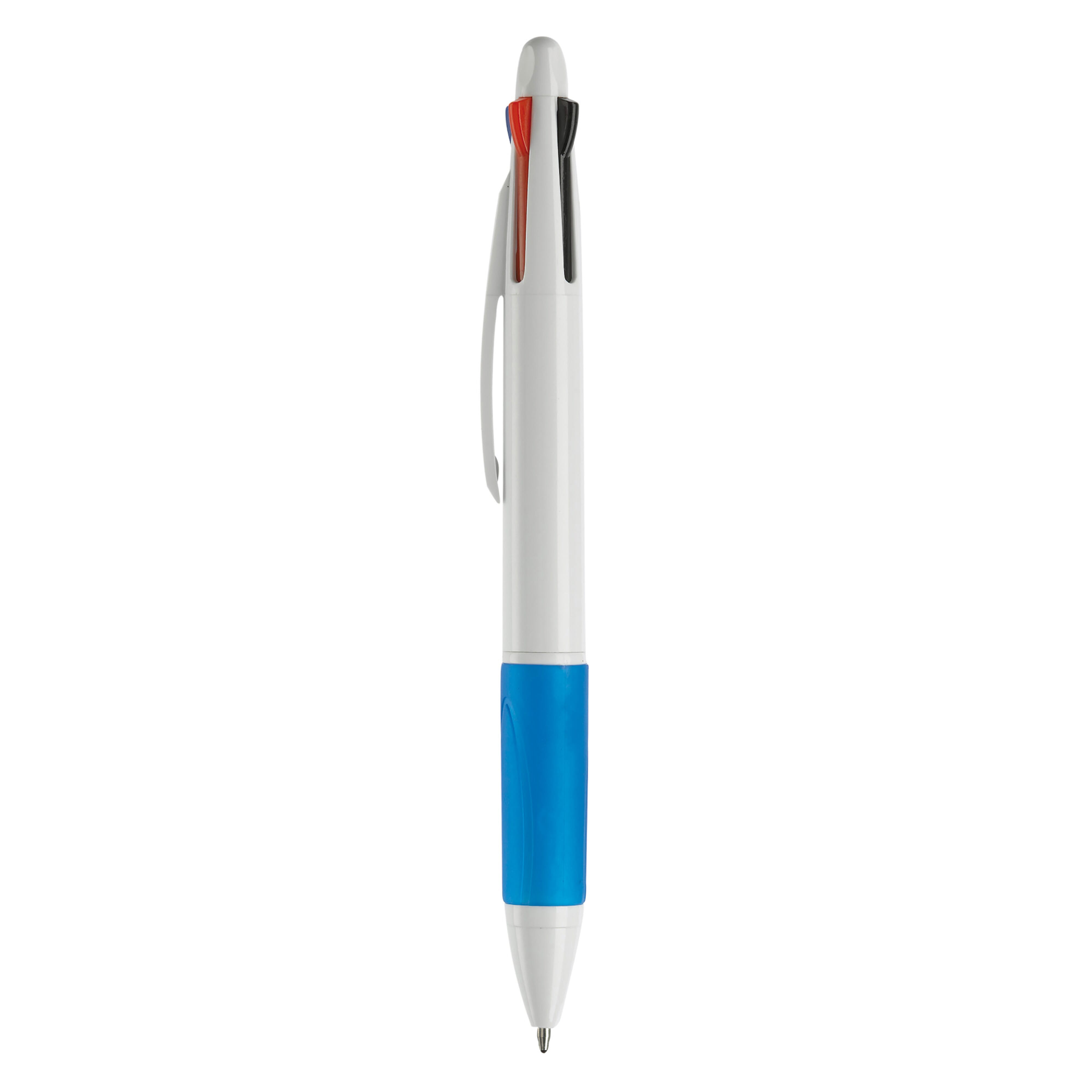 Weißer, Hardcolour Kunststoffkugelschreiber mit farbiger Gummimanschette. 4 Schreibfarben: Blau, rot, schwarz und grün.