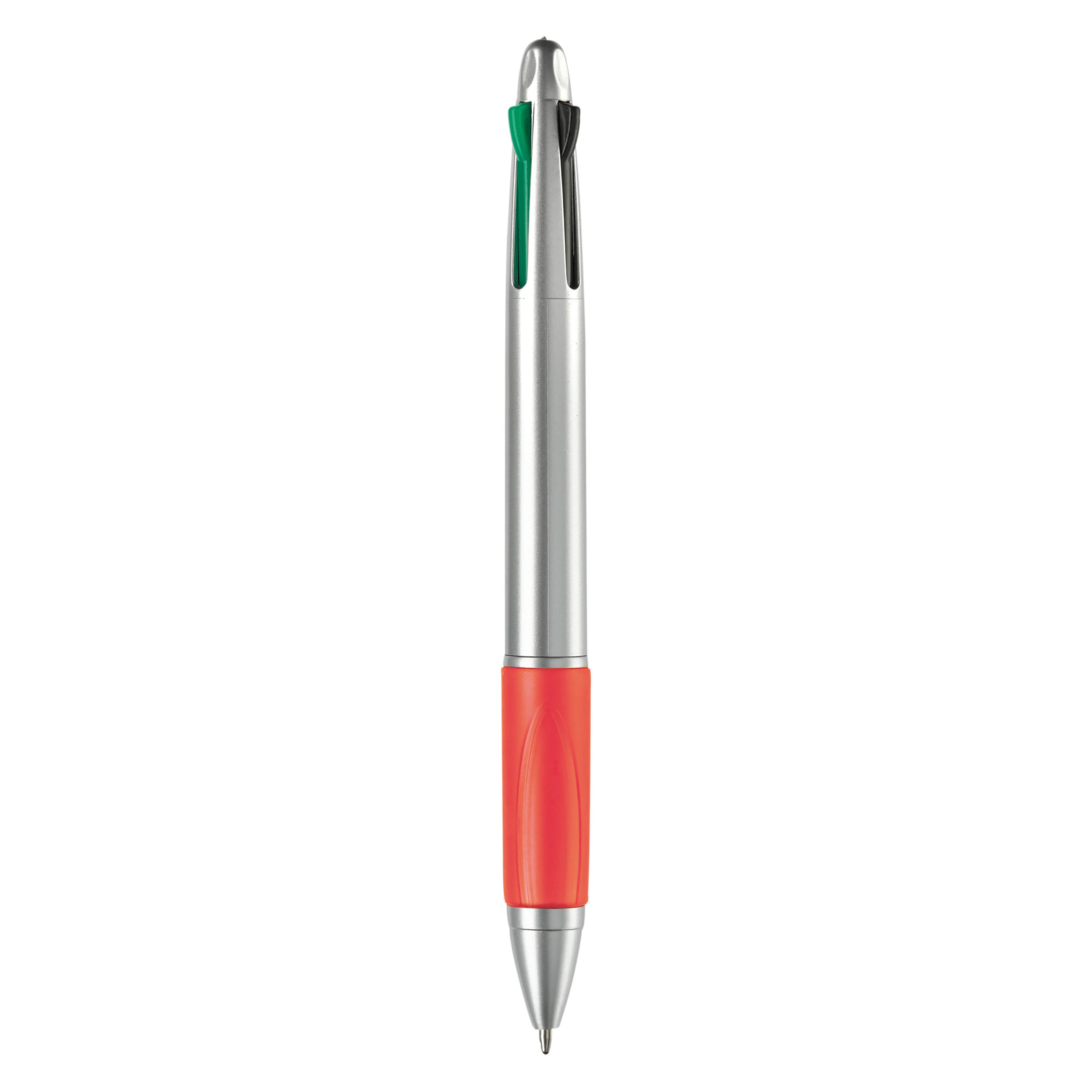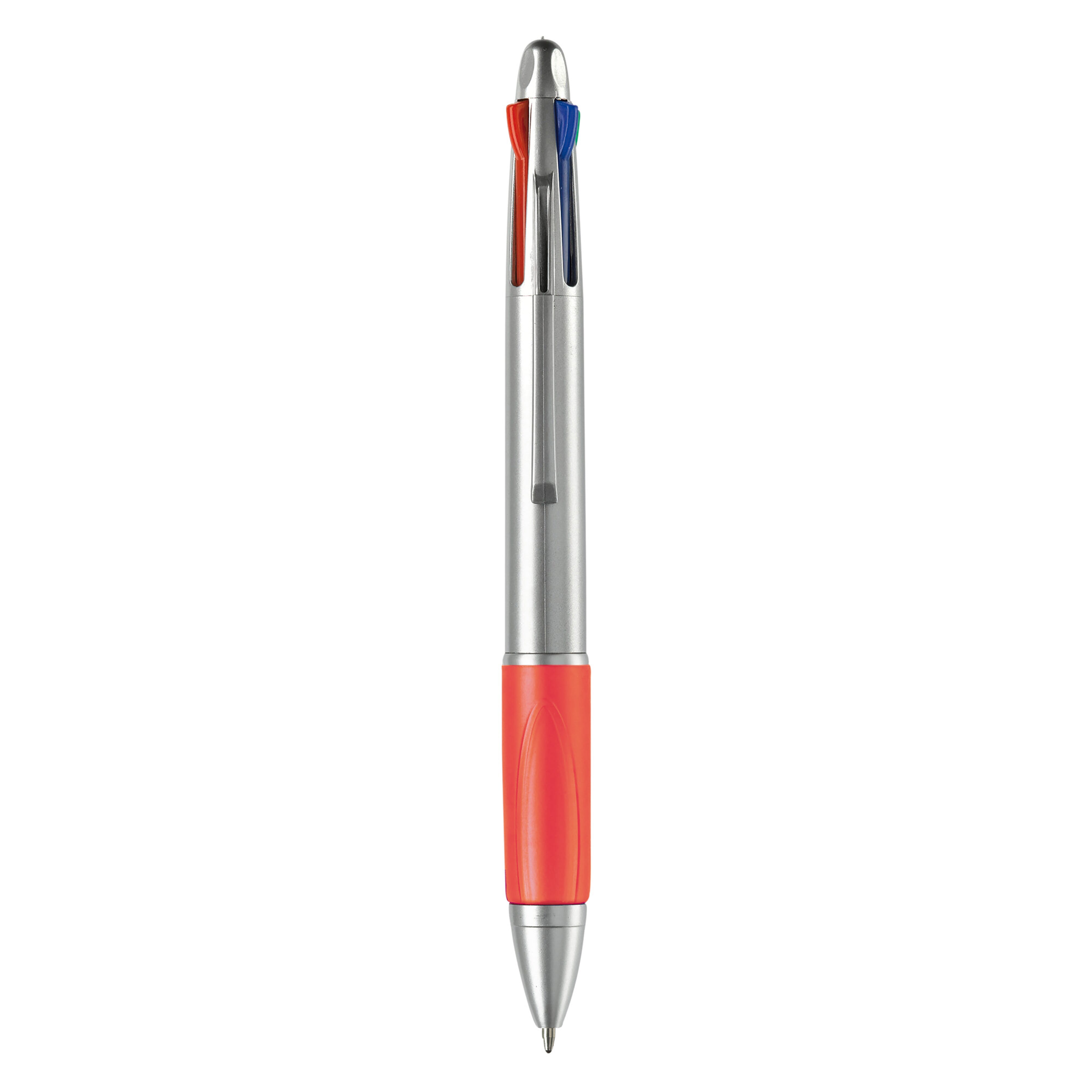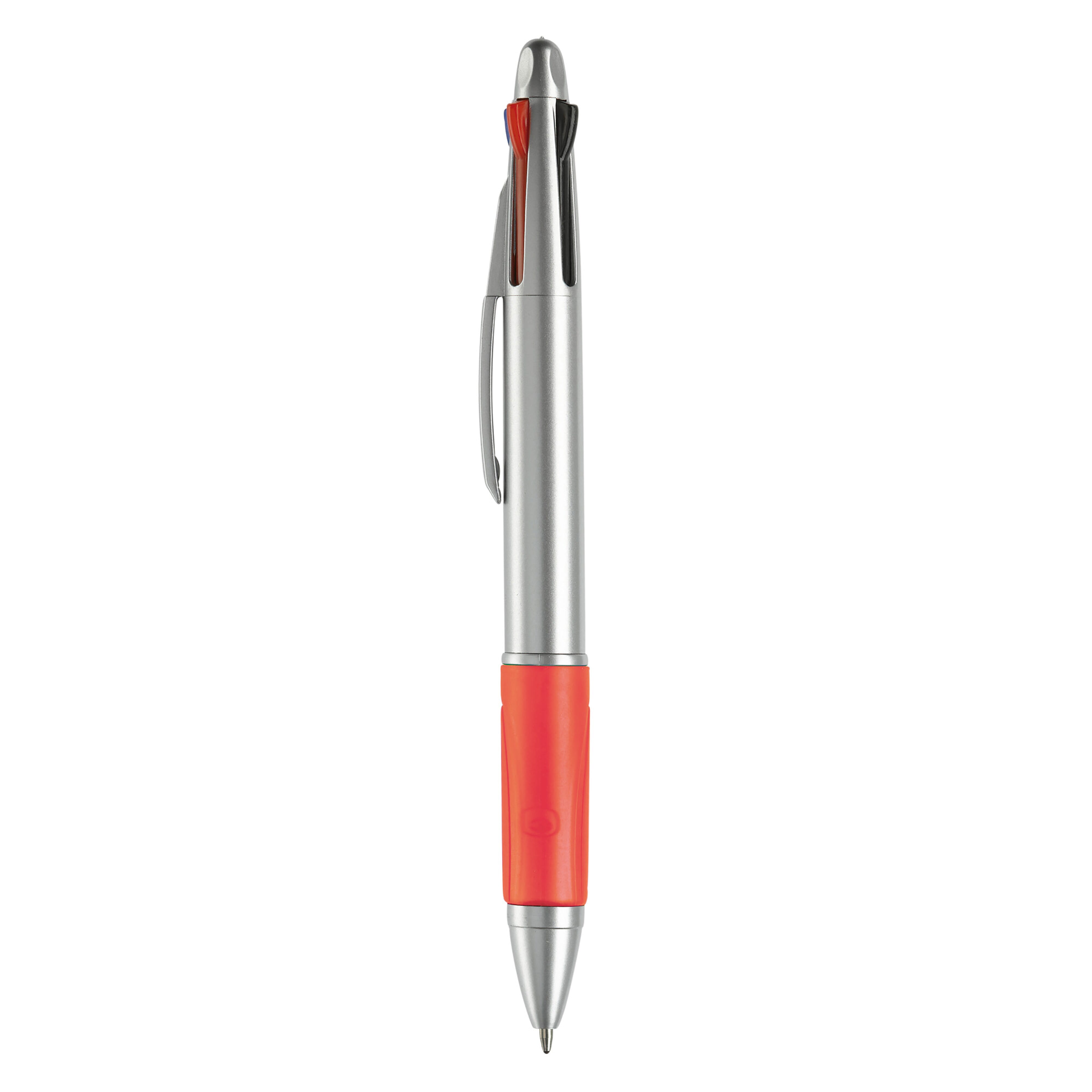Weißer, Hardcolour Kunststoffkugelschreiber mit farbiger Gummimanschette. 4 Schreibfarben: Blau, rot, schwarz und grün.