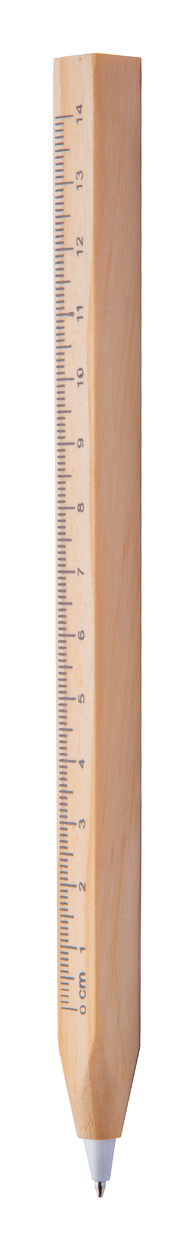 Kugelschreiber aus Holz mit eckigem Schaft und 14cm Lineal auf einer Seite, schwarzschreibend.