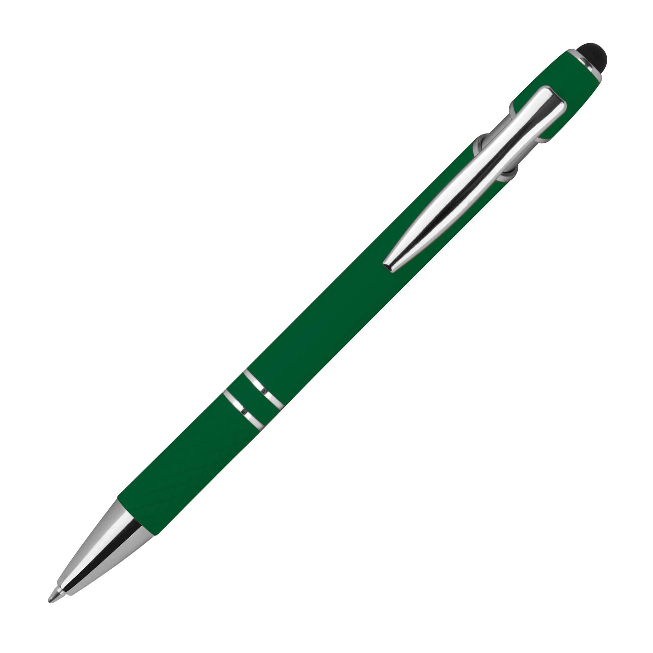 Kugelschreiber aus Aluminium mit silbernen Applikationen, blau schreibender Großraummine, Touchfunktion und gemusterter Griffzone. Ihre Werbung wird rechts vom Clip graviert.