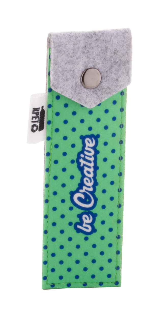 Individuelles Stiftetui aus RPET-Filz mit vollfarbig bedruckter Vorderseite und Druckknopfverschluss. Mit RPET-Label. Der Preis ist inkl. Sublimationsdruck. Mindestmenge: 50 Stk.