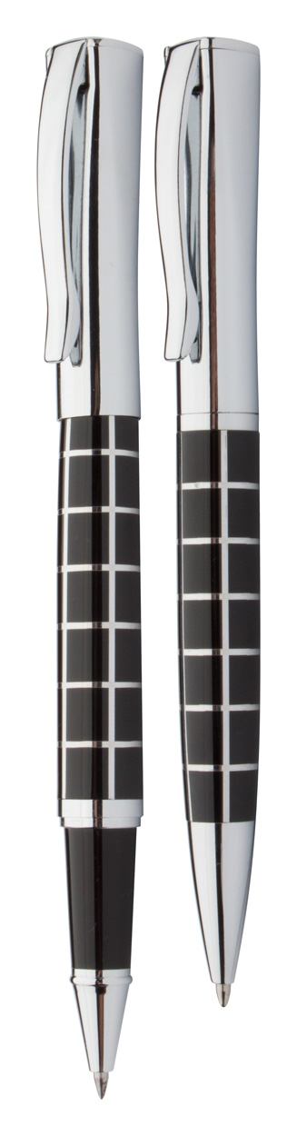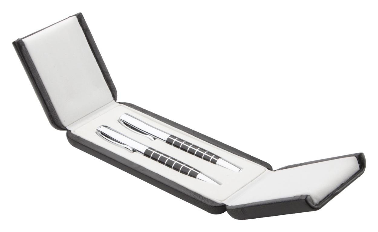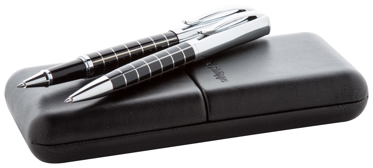 Elegantes Metall-Schreibset mit verchromten Elementen, bestehend aus Kugelschreiber, blauschreibend, und Rollerball. Einzeln in Kunstlederetui. André Philippe Markenprodukt.