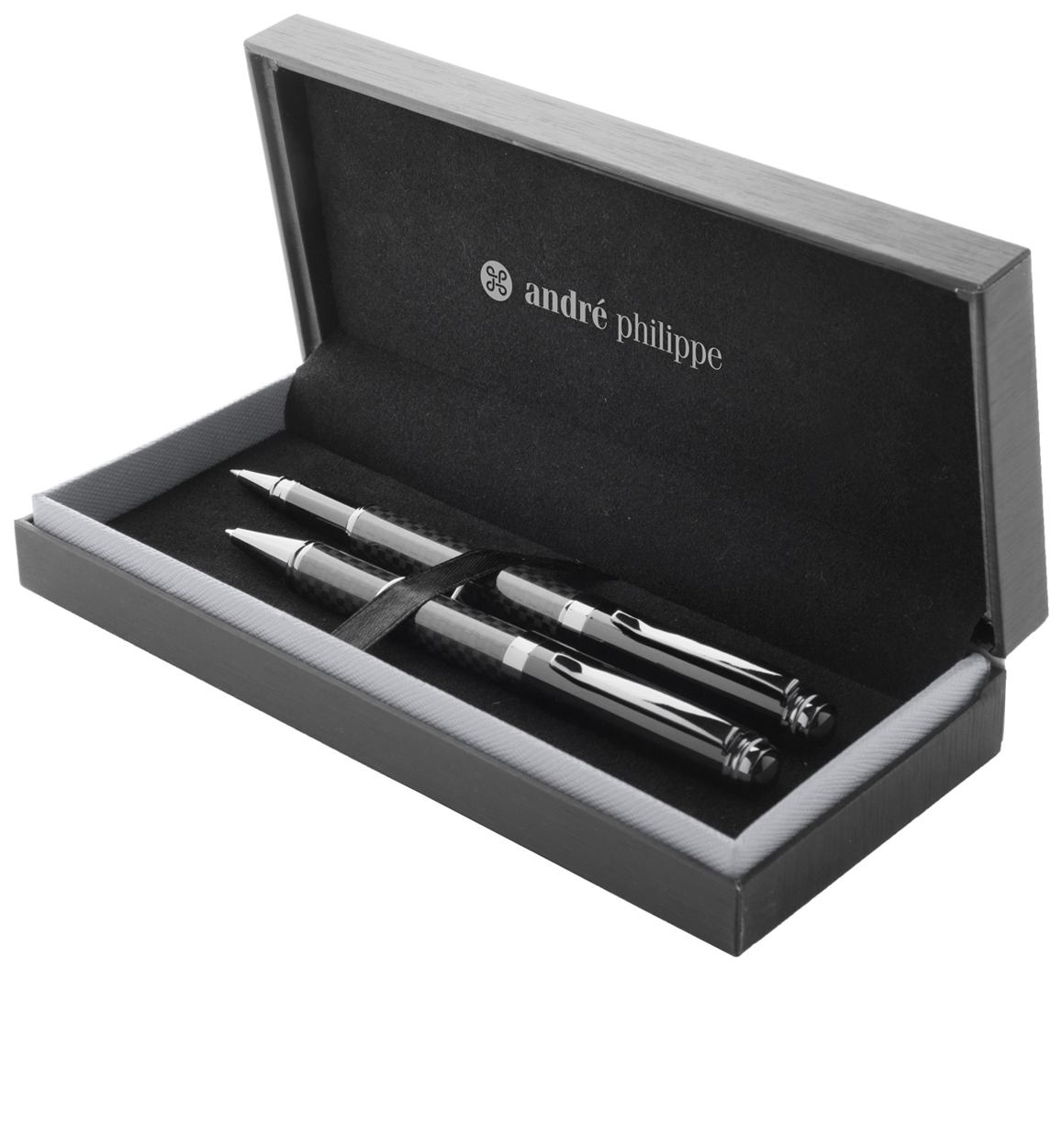 Elegantes Metall-Schreibset, bestehend aus Kugelschreiber, blauschreibend, und Tintenroller. Einzeln in schwarzer Geschenkbox. André Philippe Markenprodukt.