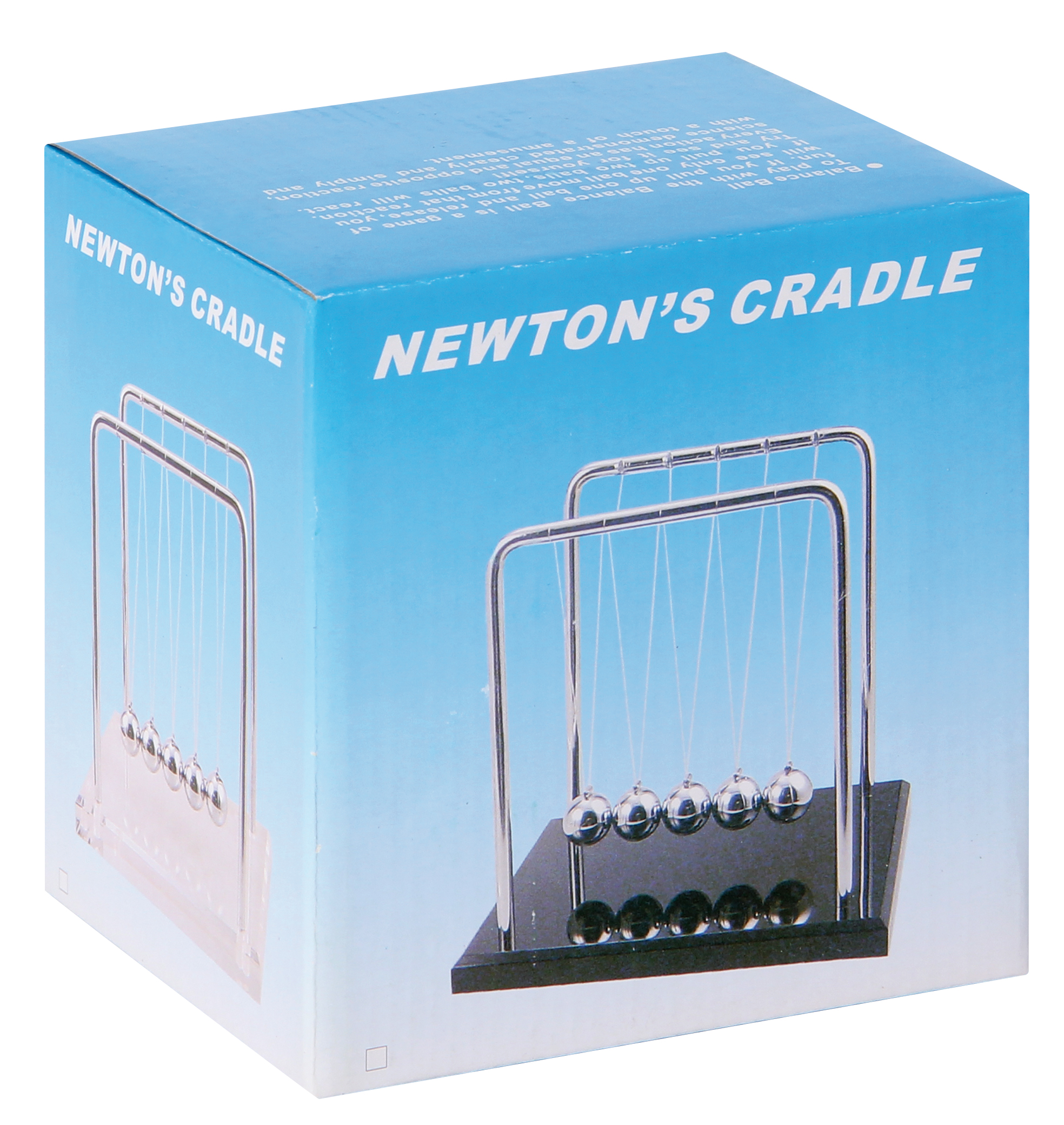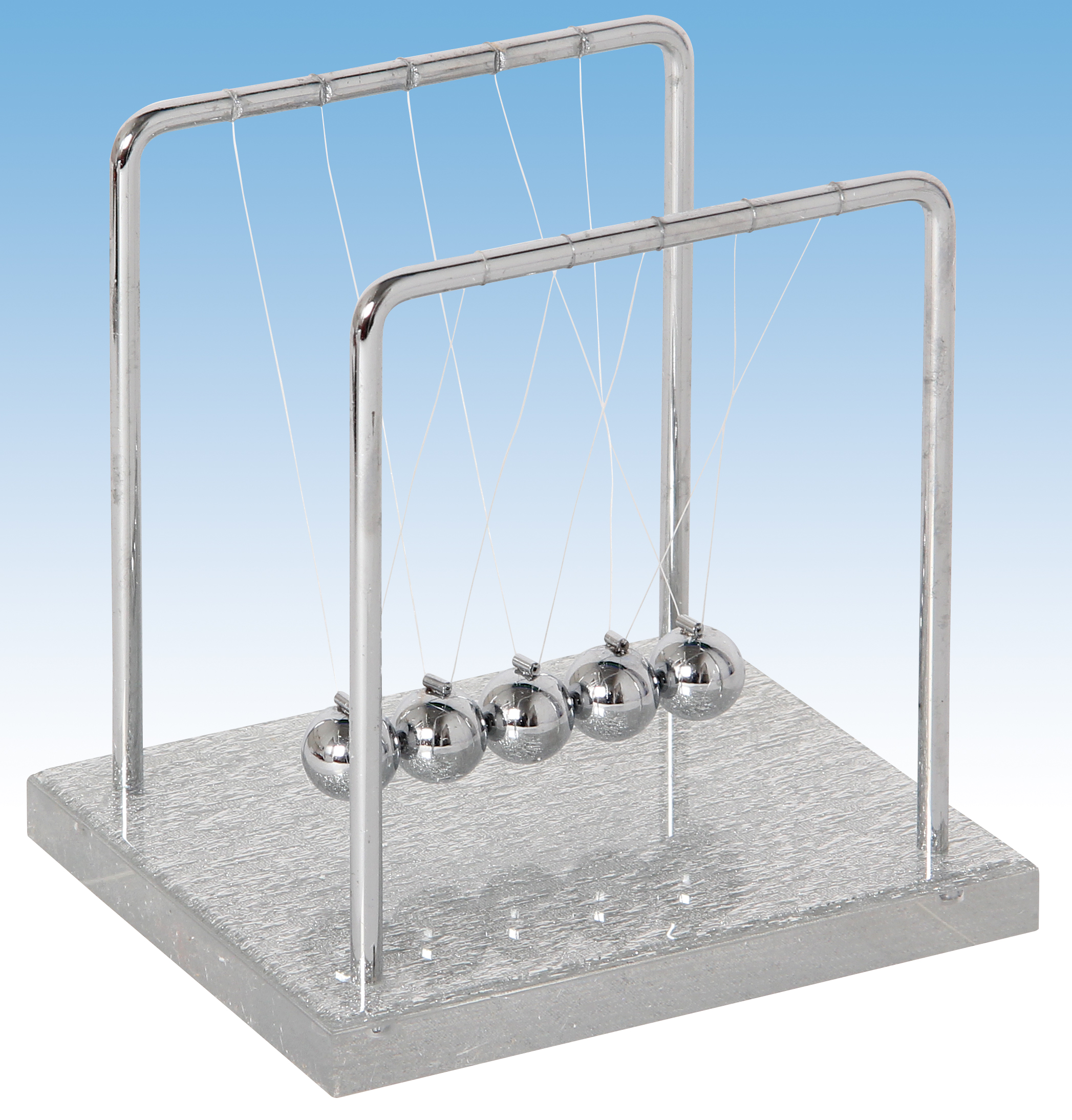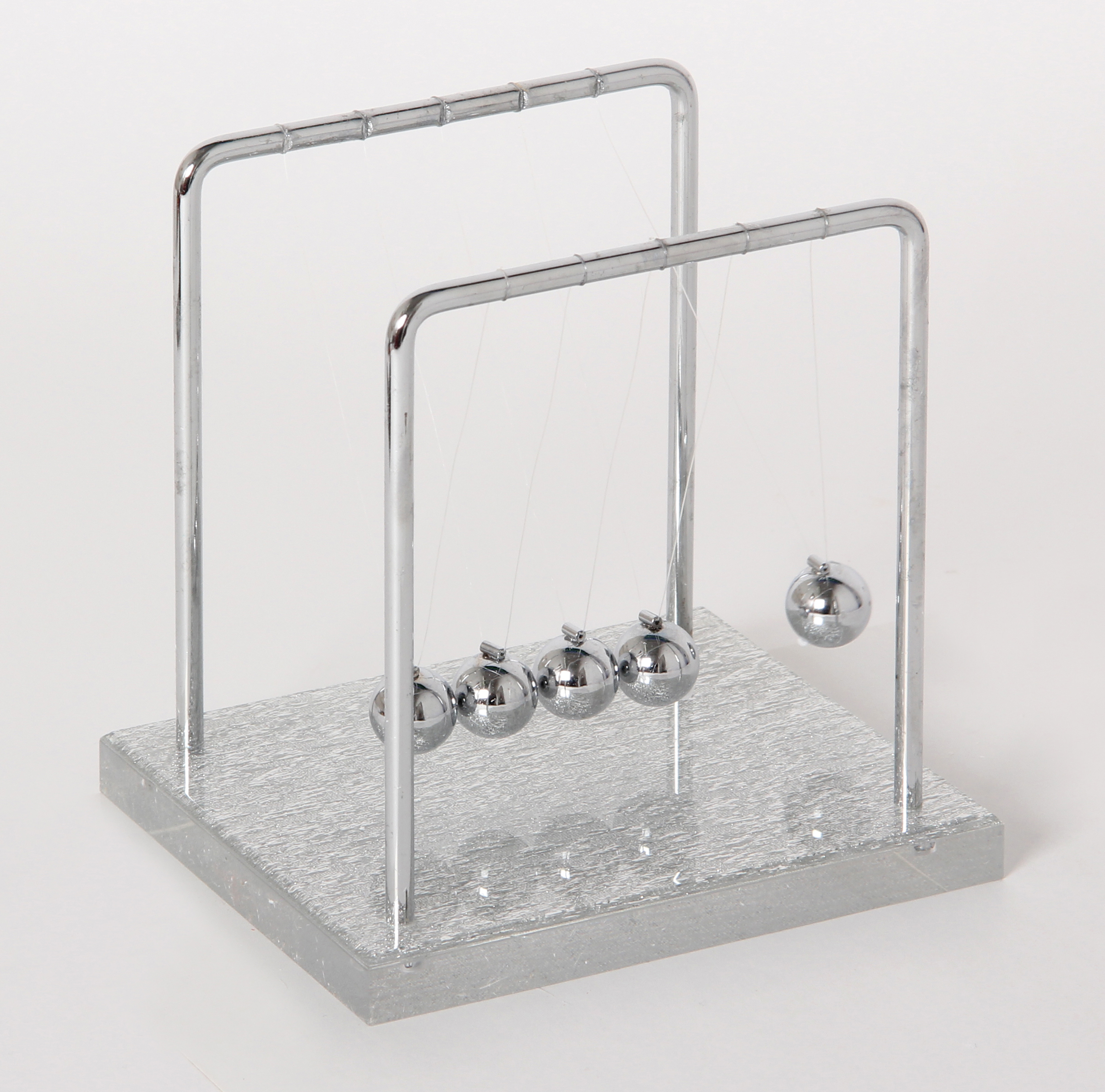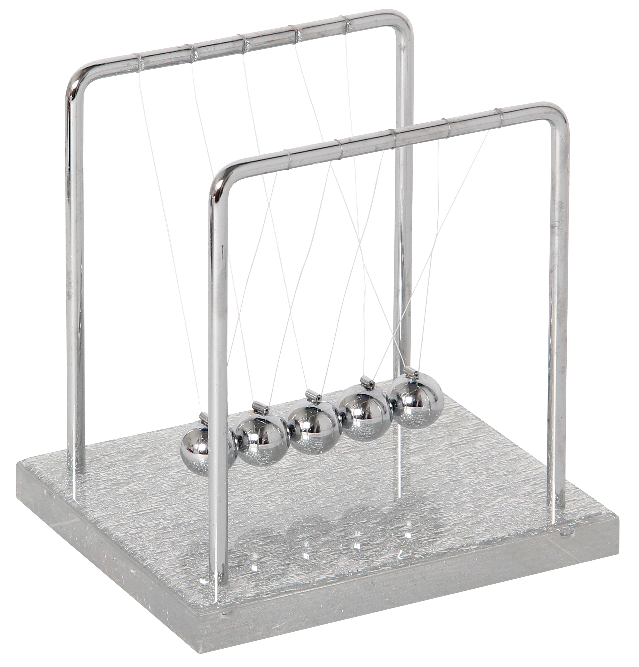 Physikalische Dekoidee, welche die Gesetze der kinetischen Energie veranschaulicht. Exklusive Ausführung mit Acrylsockel mit silbernen Glitzereffekten.