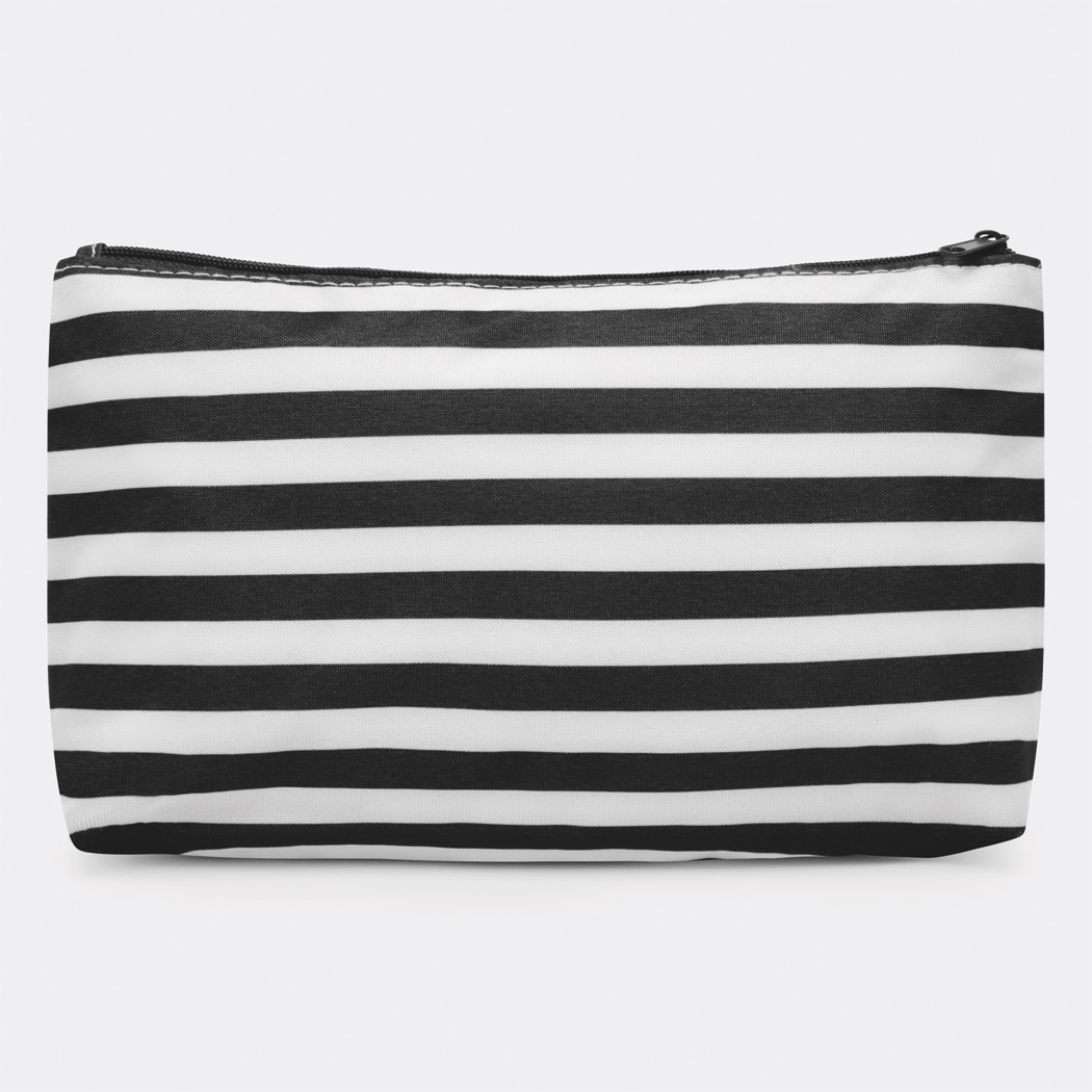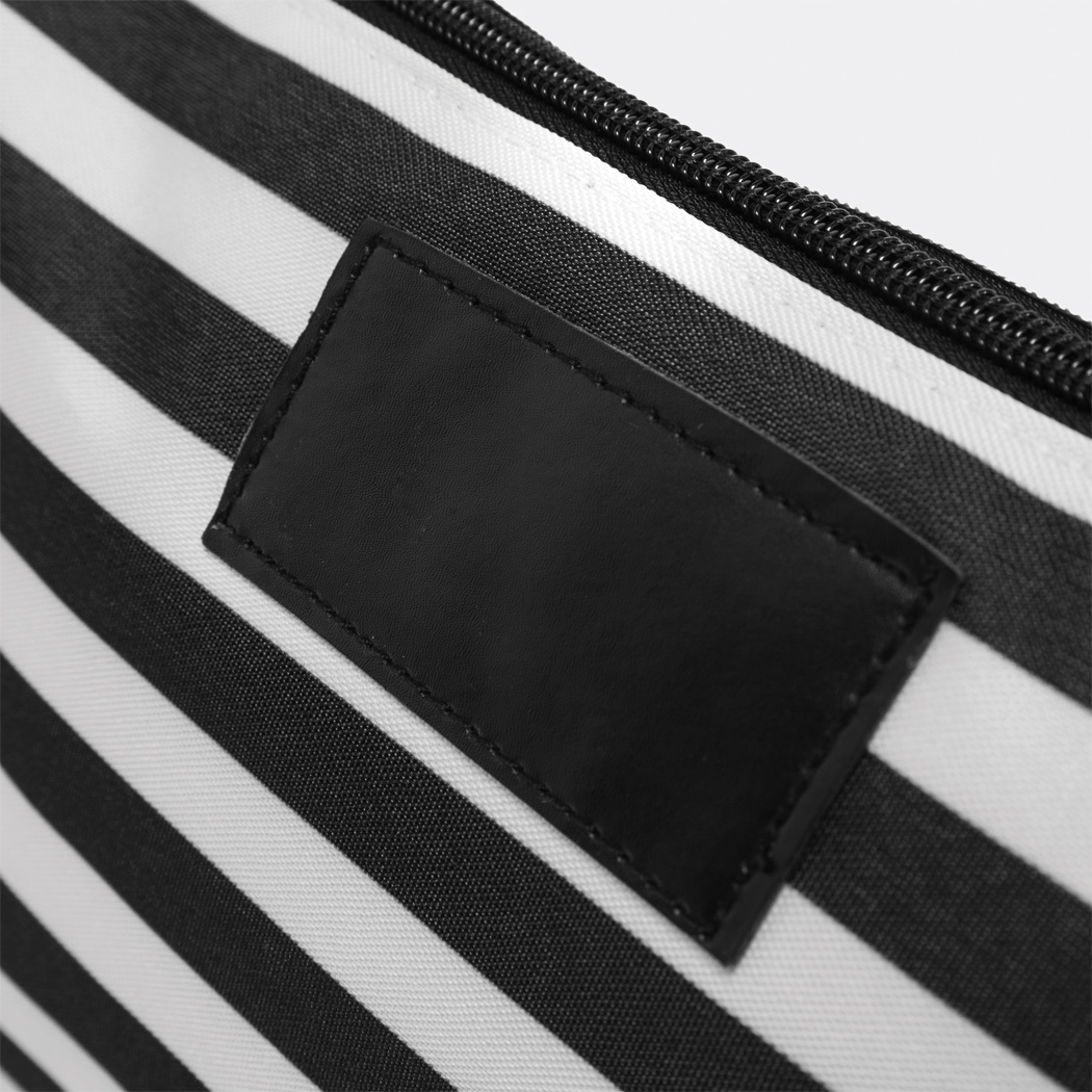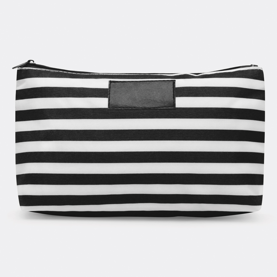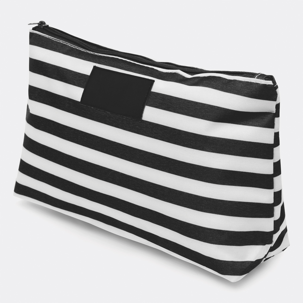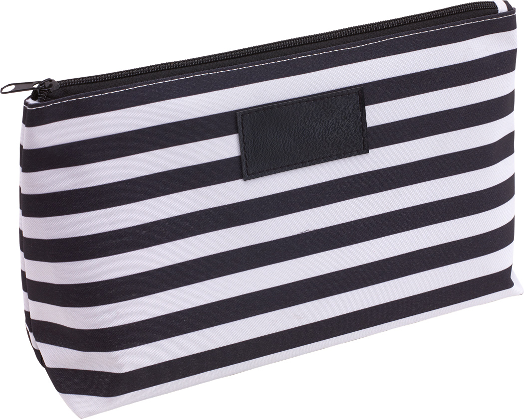 Kulturbeutel STRIPY: Hauptfach mit Reißverschluss, innen ein kleines Reißverschluss-Fach, Kosmetiktasche außen im maritimen Streifen-Look und mit Kunstleder-Applikation auf der Front für eine Werbeanbringung – ideal für Kosmetik und Pflegeartikel