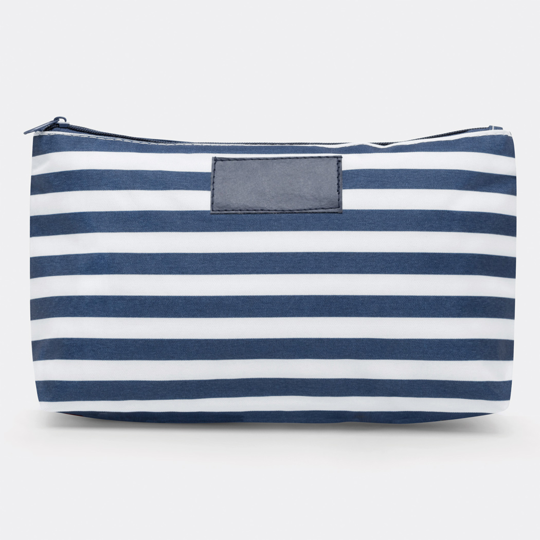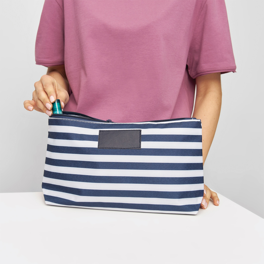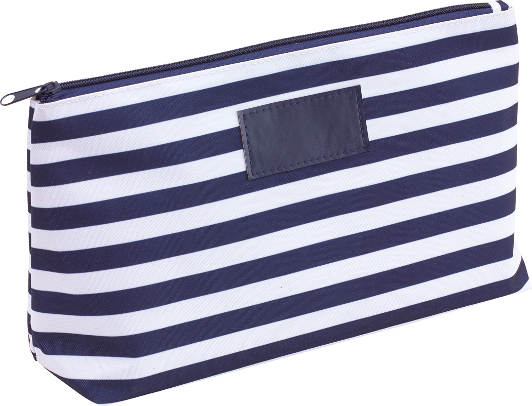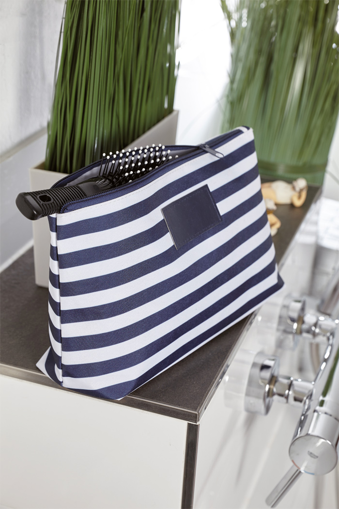 Kulturbeutel STRIPY: Hauptfach mit Reißverschluss, innen ein kleines Reißverschluss-Fach, Kosmetiktasche außen im maritimen Streifen-Look und mit Kunstleder-Applikation auf der Front für eine Werbeanbringung – ideal für Kosmetik und Pflegeartikel