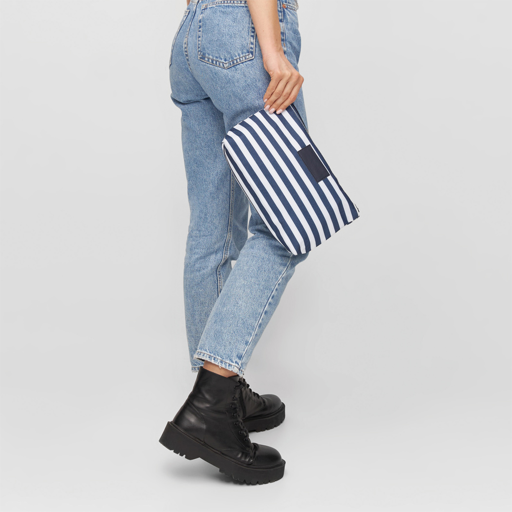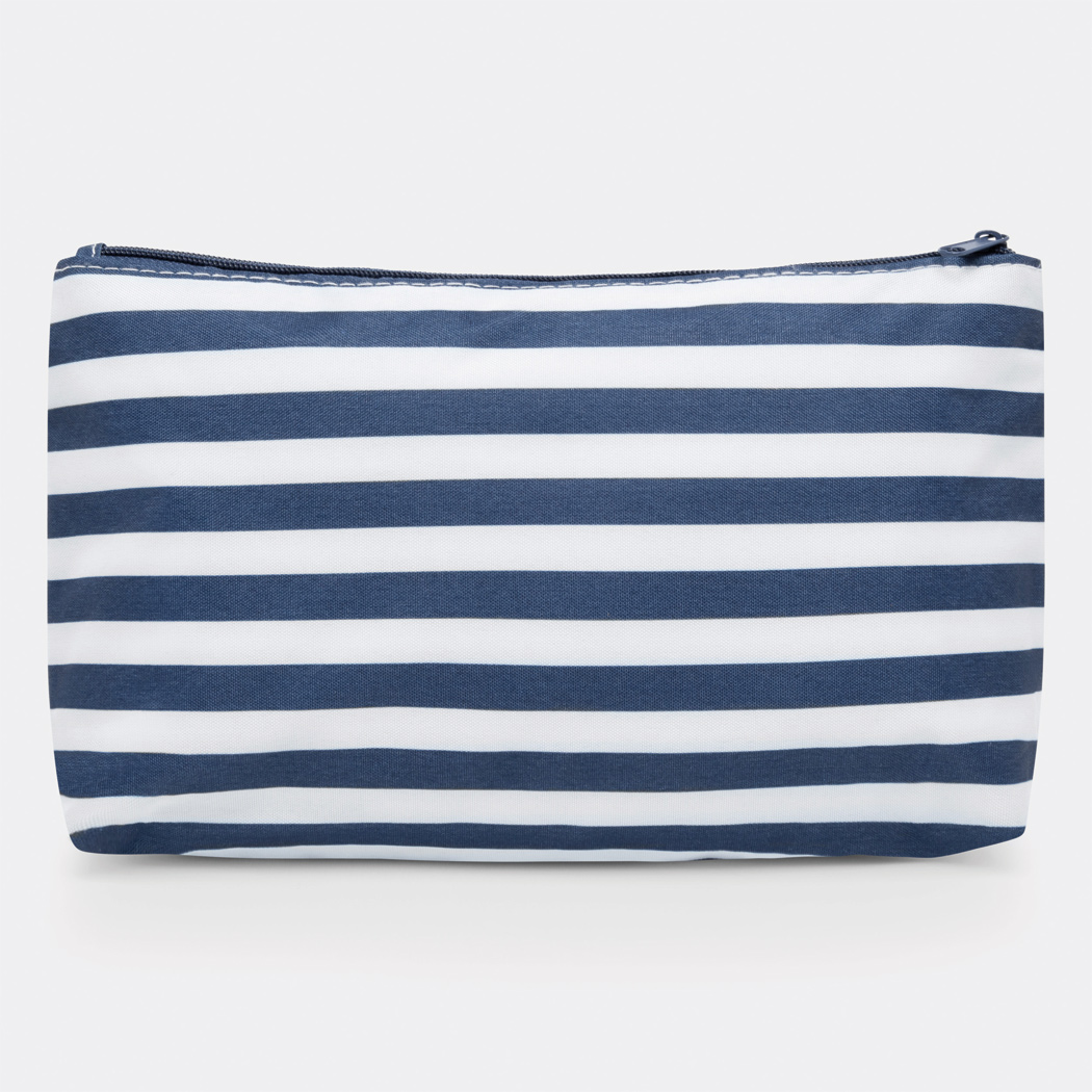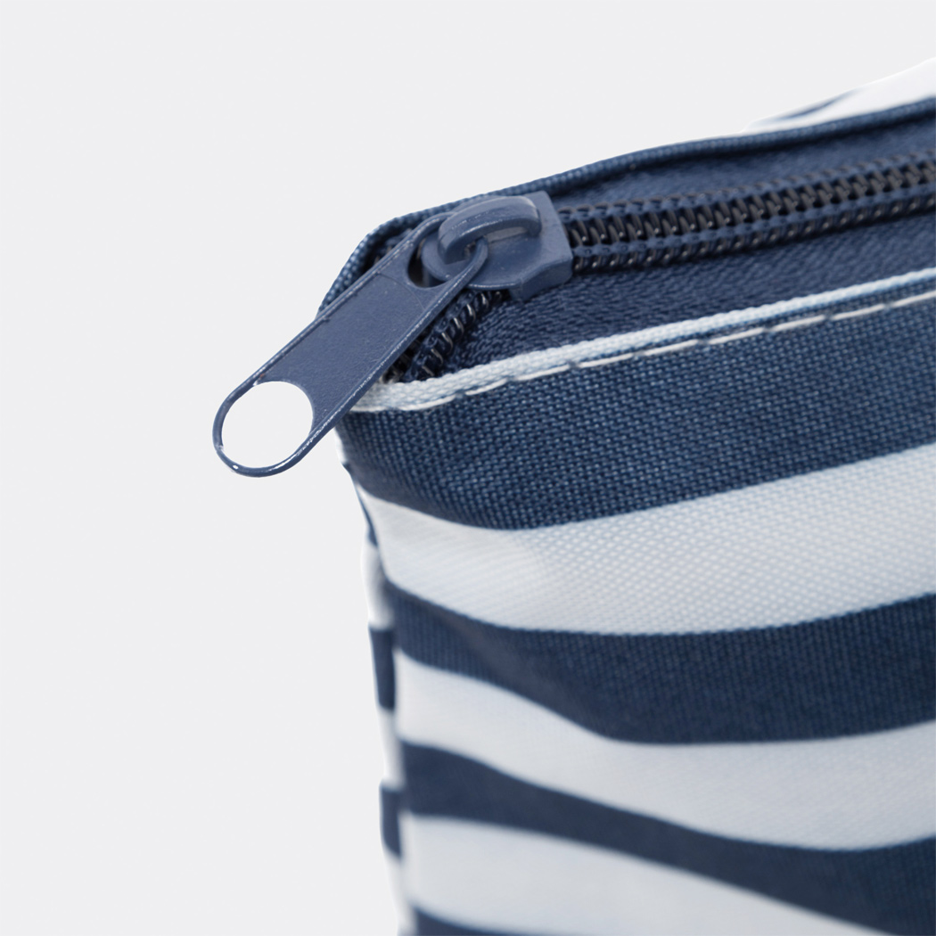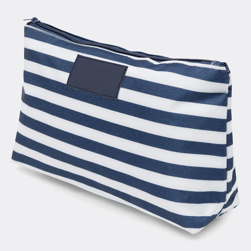 Kulturbeutel STRIPY: Hauptfach mit Reißverschluss, innen ein kleines Reißverschluss-Fach, Kosmetiktasche außen im maritimen Streifen-Look und mit Kunstleder-Applikation auf der Front für eine Werbeanbringung – ideal für Kosmetik und Pflegeartikel