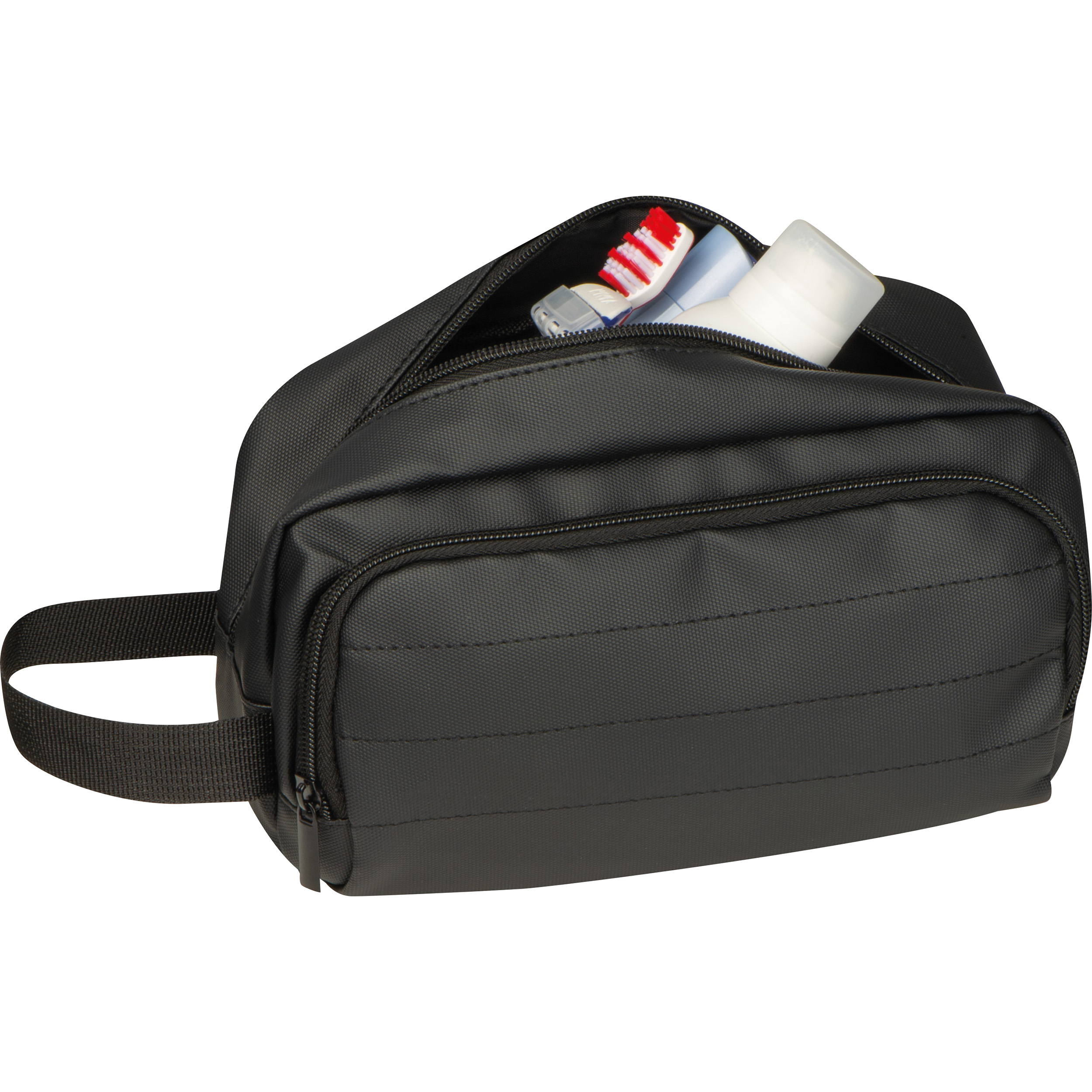 Hochwertige gepolsterte Kulturtasche aus Polyester mit PU-Beschichtung. Sie hat neben dem Innenfach mit Reißverschluss noch ein Reißverschlussvorfach sowei eine Trageschlaufe. Robust und wasserabweisend, perfekt für Reisen und den täglichen Gebrauch. Ihrer Werbung drucken wir auf den Kulturbeutel.