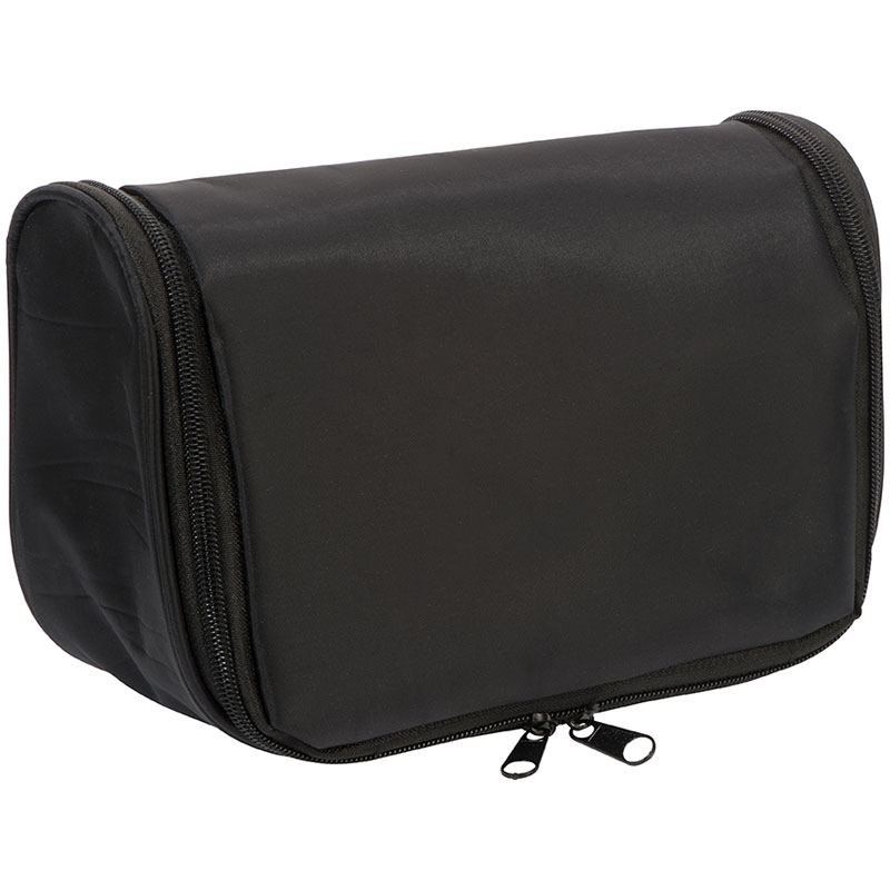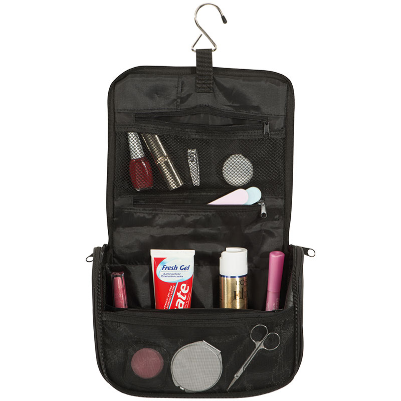 Kulturtasche aus 190D Nylon mit einem großen Innenfach, drei Reißverschlussfächern, vier Gummibändern und einem Haken zum Aufhängen. Ihre Werbung wird vorne auf die Tasche gedruckt.