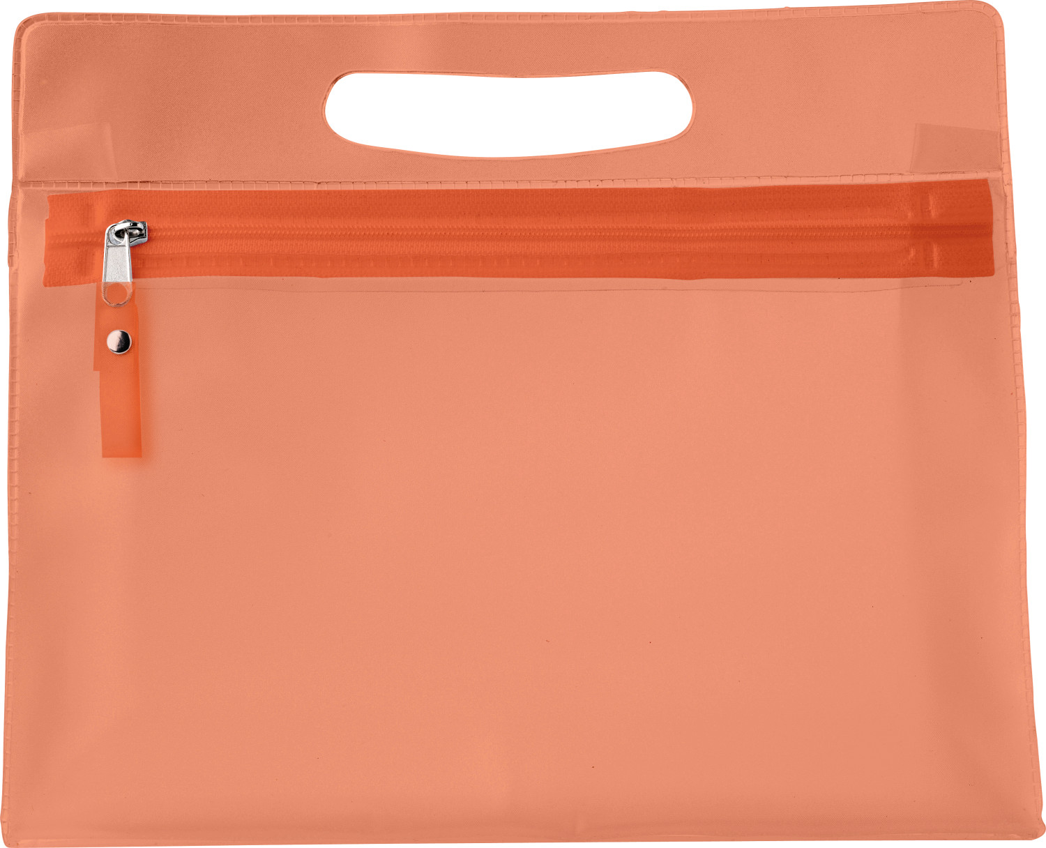Kulturtasche aus PVC, transparent gefrostet, mit Reißverschluss und Griffaussparung für eine angenehmes Tragen.