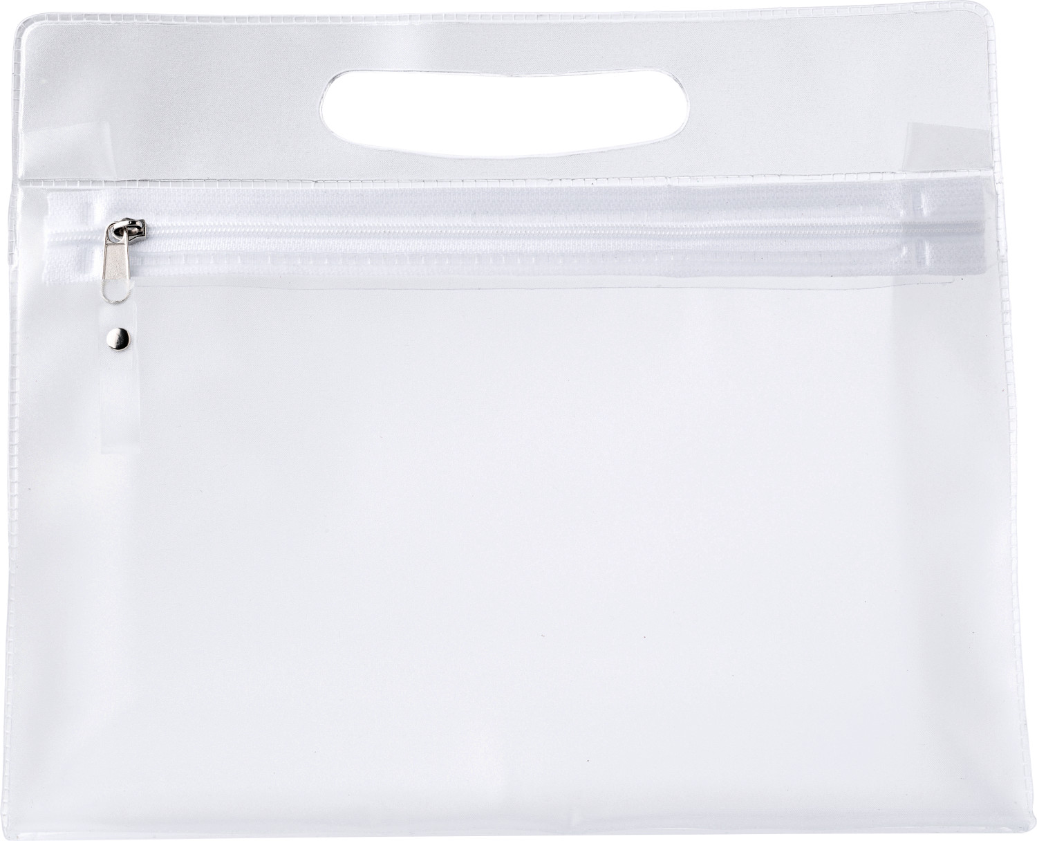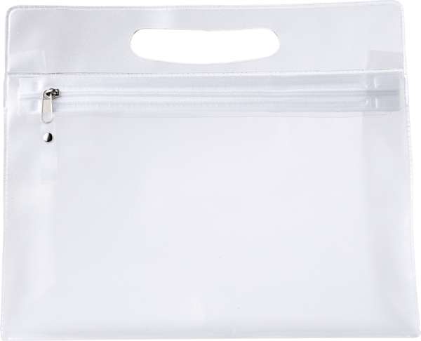 Kulturtasche aus PVC, transparent gefrostet, mit Reißverschluss und Griffaussparung für eine angenehmes Tragen.