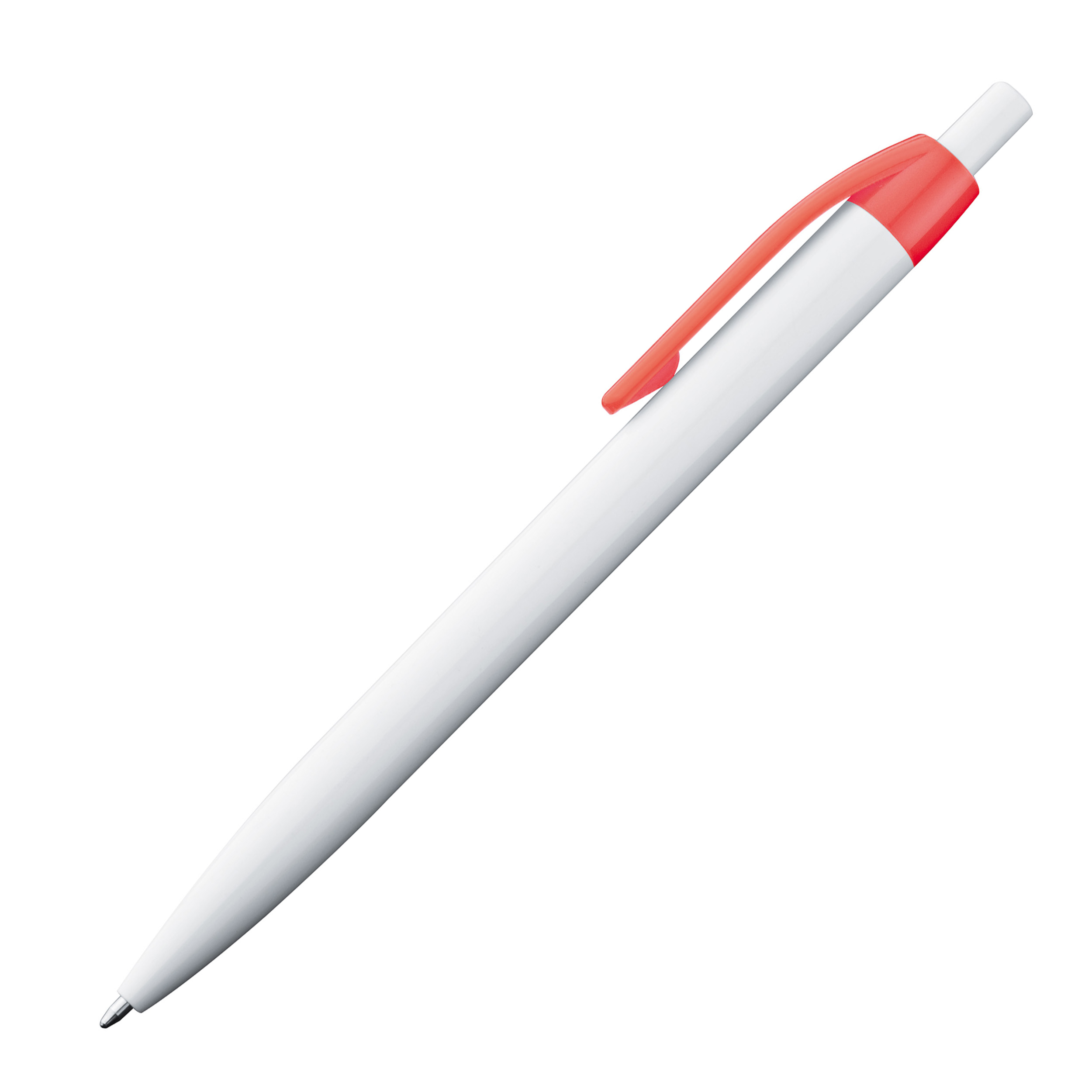 Trendiger Druckkugelschreiber mit blau schreibender Mine. Durch den weißen Schaft kommen die leuchtenden Farben des Clips hervorragend zu Geltung. Ihre Werbung drucken wir auf den Schaft.