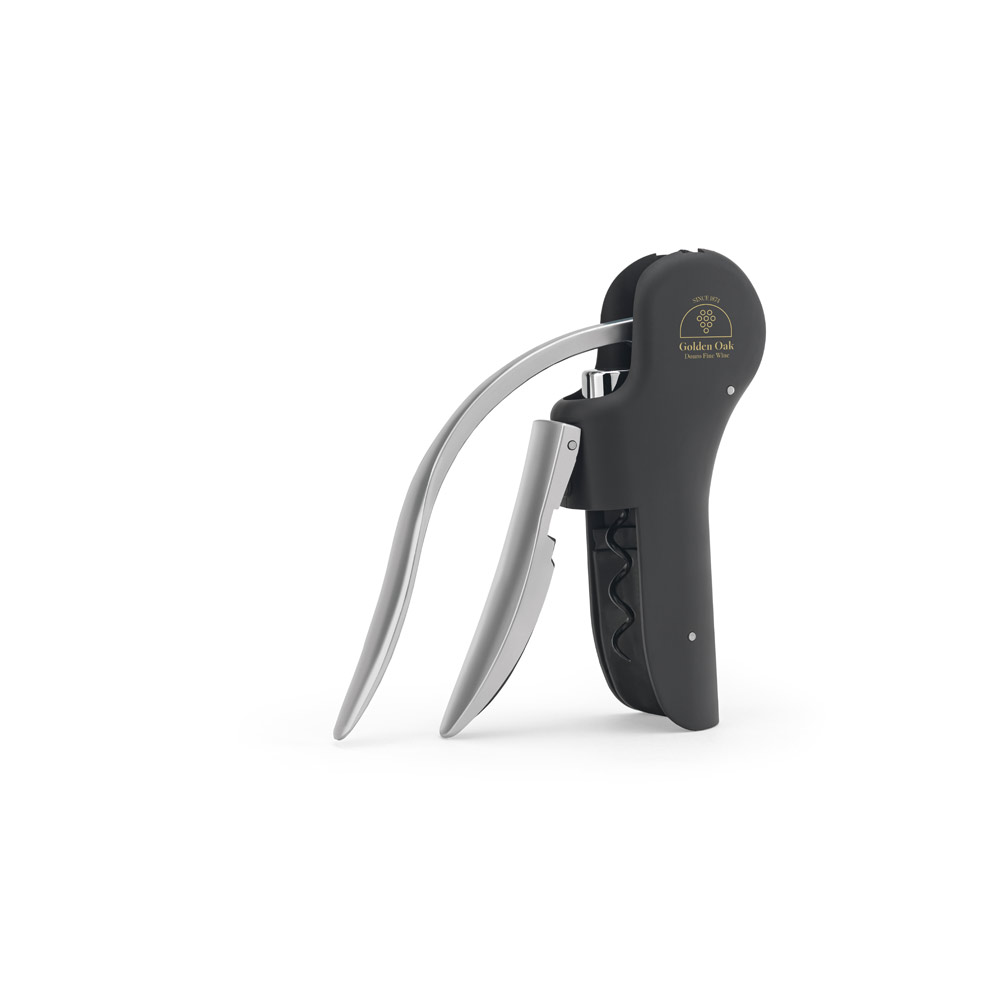 Korkenzieher aus ABS und Zink mit gummierter Oberfläche. SDank seines automatischen Hebels können Sie Flaschenkorken mit wenigen Handgriffen mühelos entfernen. Ein nützliches Werkzeug für Weinliebhaber. Wird in einem Geschenkkarton geliefert. 129 x 150 x 40 mm