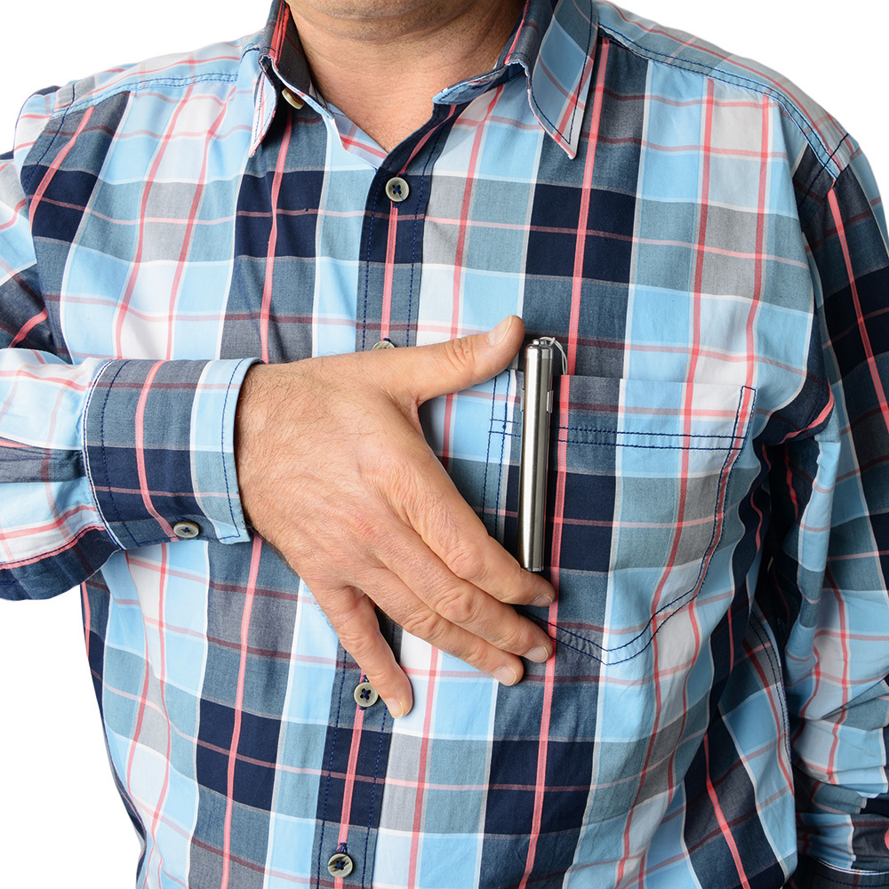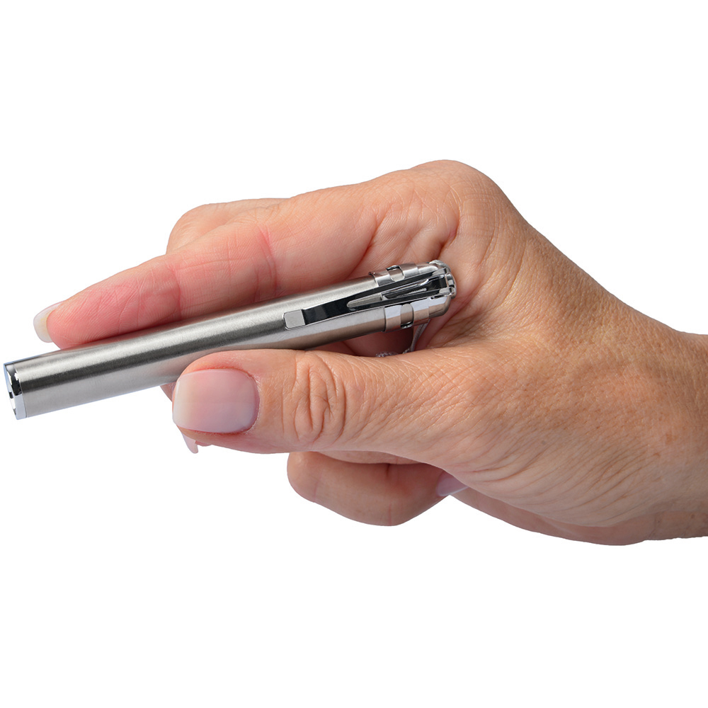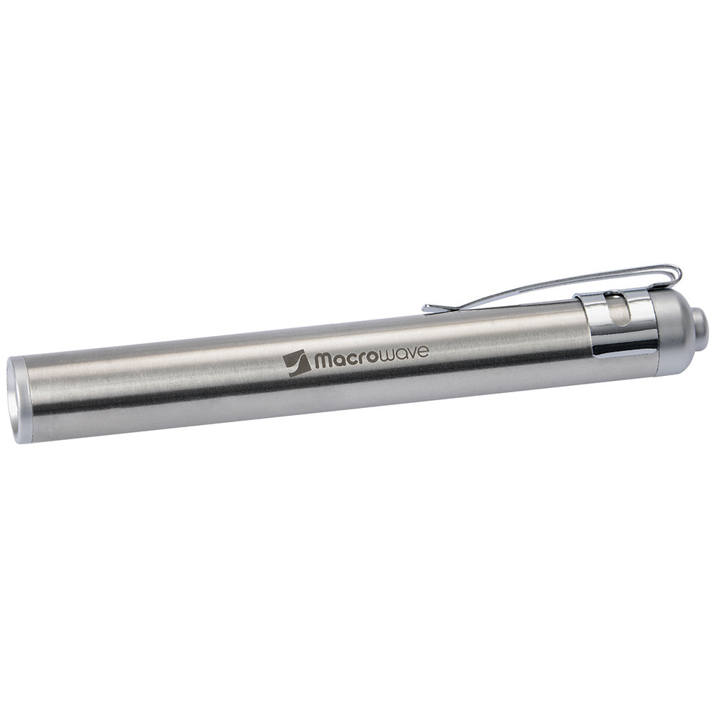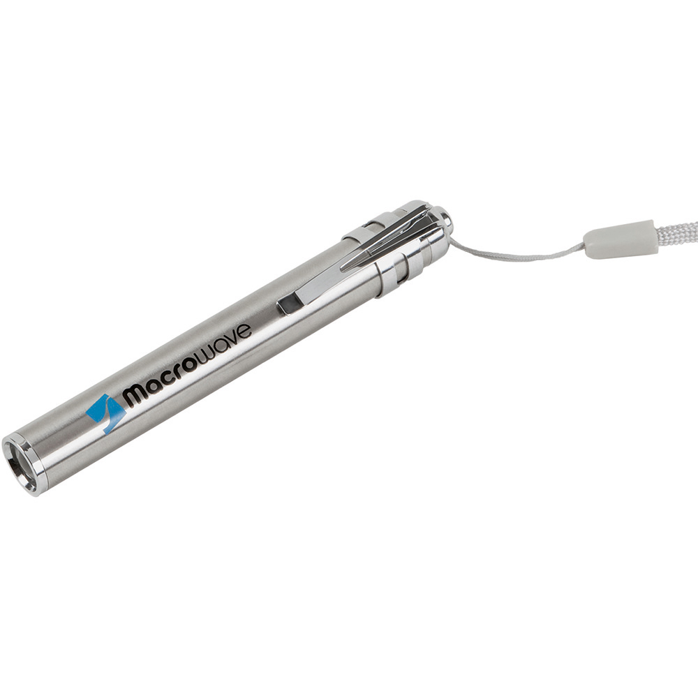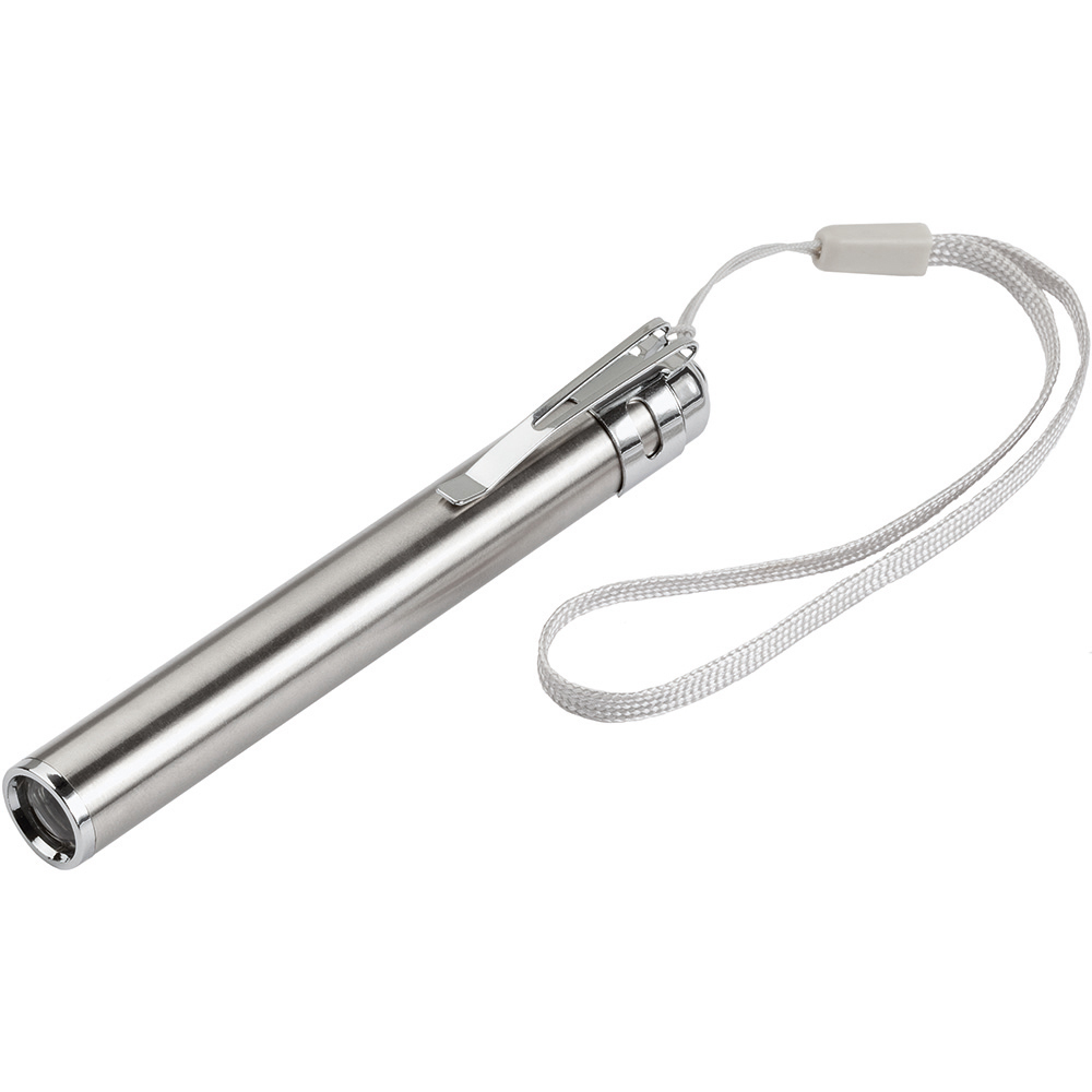 LED Taschenleuchte und Inspektionsleuchte. Die äusserst schlanke LED Leuchte im Stift-Format aus matt gebürstetem Edelstahl ist vielseitig als Werbeträger einsetzbar. Der Spot der Leuchte mit seinem weißen Licht ist so gewählt, dass er sich für kurze Entfernungen ideal eignet, aber auch zur Ausleuchtung der näheren Umgebung. Mit dem praktischen Clip, der auch abnehmbar ist, ist die LED Leuchte schnell an der Brusttasche usw. befestigt. Die Trageschlaufe garantiert, dass Sie die Leuchte immer fest im Griff haben. Gehäuse: Edelstahl. Leuchtmittel: 0,5W SMD LED. Lichtwerte: 20 Lumen. Leuchtdauer: ca. 5 Stunden. Leuchtmodi: 100% Power weißes Licht. Equipment: Handschlaufe, Clip. Stromversorgung: 1 x AAA Batterie (inkl.). Verpackung: hochwertige Karton-Geschenkverpackung.