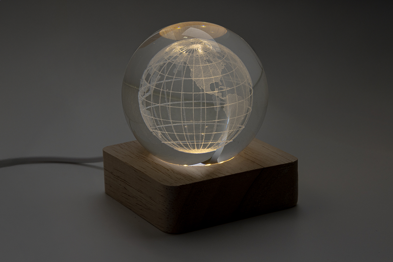 Glaskugel mit LED-Lichtsockel aus Holz. Inklusive USB-Ladekabel.