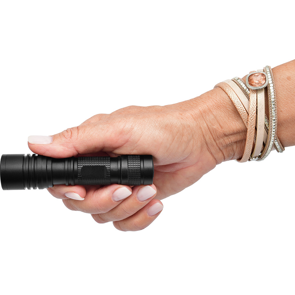 LED Taschenleuchte mit Fokussierung und Signallichtfunktion. Eine handliche Leuchte mit insgesamt 3 Leuchtmodi für einen vielseitigen Anwendungsbereich. Gehäuse: Aluminium eloxiert. Leuchtmittel: 1W SMD LED. Lichtwerte: 60 Lumen. Leuchtmodi: 100% Power weißes Licht / 50% Power weißes Licht / Strobe weißes Licht. Equipment: fokussierbar durch Herausziehen des Leuchtenkopfes, Handschlaufe. Schutzklasse: IP44. Stromversorgung: 1 x AA Batterie (inkl.). Verpackung: schwarze Geschenkverpackung.